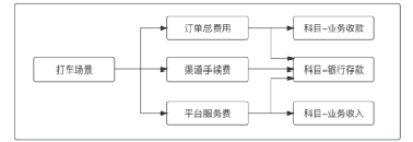 在上述的场景中,就会发生交易,因此会产生一系列的费用,例如打车单的相关费用费用包括下面这些,完单后要给司机做结算就有了订单结算费用,平台要抽取一定服务费就有了平台服务费用,如果是在高峰期,要给司机发一些补贴,就有了高峰补贴费等等。费用就是站在业务角度定义资金的业务属性,基于业务侧的费用我们可以关联到后续的财务科目,费用是从业务发生那一刻就产生,而且最后可以关联到会计科目的核算内容。