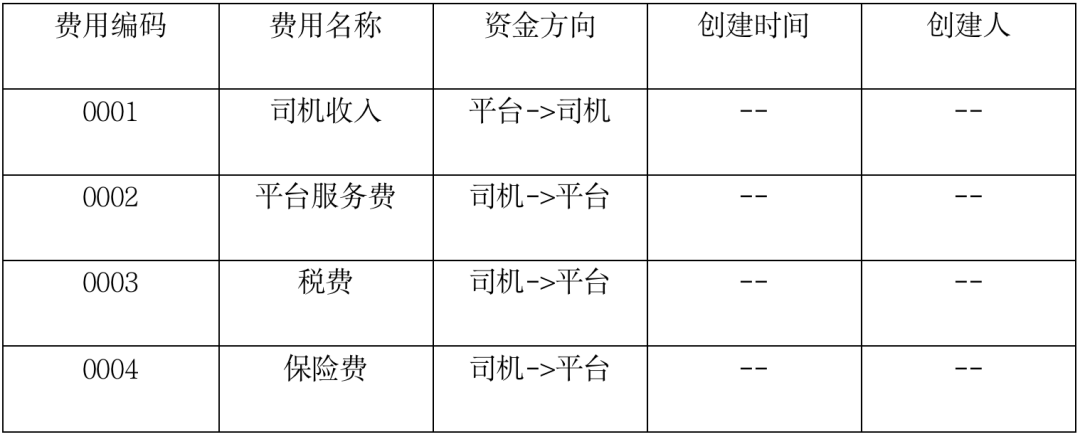 计算业务场景中产生的费用需要一个强大的计费系统,例如上一小节中的场景,在下单前需要进行费用的预计算,用户选择起点和终点后预先计算可能需要的订单费用;在订单进行中需要实时计算费用,订单结束后需要计算出本单实际产生的费用。从图中可以看出来订单总费用包含三部分:起步价+里程费+时长费;你可能会问,一个订单为什么要拆成这么多费用呢?简单想一下,这三个费用的特点,而且这三个费用在不同的城市,不同的时段,不同的用户,不同的车型都会发生变化,所以可以理解为,费用的细化是精细化运营的必然结果,另外用户也需要知道为什么收这么多钱。订单完结后就需要给司机做结算,就需要再进行一次计算,计算出这一单应该给司机多少钱,平台抽多少钱,要不要实时扣税,有没有其他费用,比如保险费等,即可以得出如下的清算结果。前面讲了交易场景和费用的定义,现在进行费用设计的分析,设计费用有三个关键点:费用编码、费用名称、费用结构。当然,围绕费用可以展开非常深的研究,如与科目的关联、费用的资金方向、用途等,本部分仅从简单的原理进行设计,不做过于复杂的分析。设计办法常见的有2种:一级枚举型,就是费用之间没有关系,对所有费用进行枚举,如下表;另一种是多级结构,可以对费用进行分组,在不同的使用场景下展示不同级别的名称。以上两种方式可能第二种更好一些,特别是在核算和统计时,可以进行总分分别进行统计分析和核算。