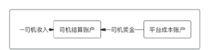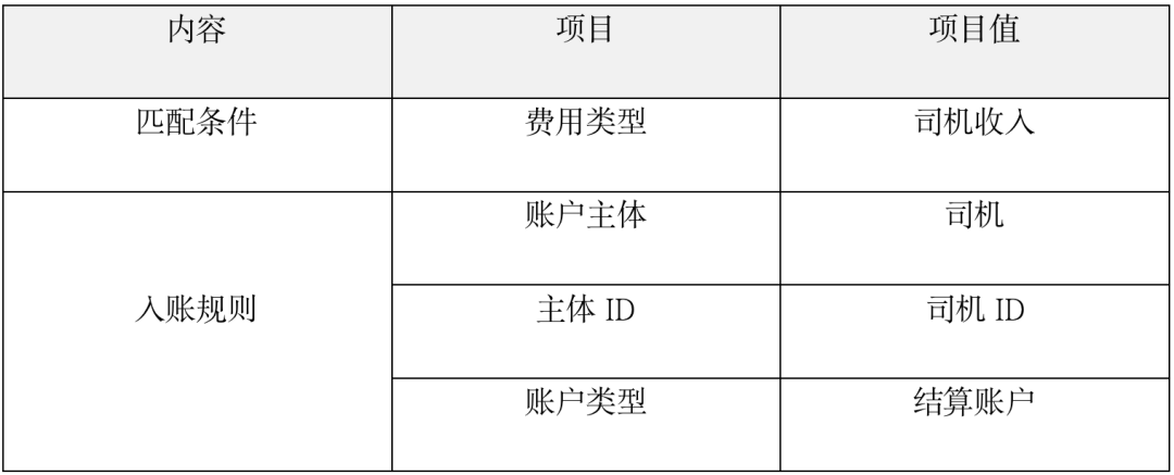 在交易的每一个节点都会产生费用,或者计算出相关的费用,例如司机收入。计费之后就需要计入相关的账户,如司机收入要计入司机的结算账户;有时候一个费用要计入多个账户,又比如司机奖金可能要同时计入平台的运营账户和司机的结算账户。入账规则的设计有两个关键点,一个是匹配条件,要以入账请求的传参为条件匹配到相关的入账规则条目,需要定义每类记账请求需要什么条件,比如司机收入入账,一个“费用类型”作为条件就够了;另一个是入账规则,就是这个条目指定入什么账户,比如司机收入匹配到的规则是要记入司机结算账户,则入账规则如下: