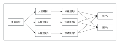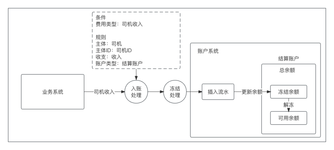 基于上面的规则,上游系统在申请入账时必须传几个参数:费用类型、主体类型、主体id。基于司机收入这个费用,就可以匹配出一条规则,应该入司机的结算账户,利用司机ID找到相关的结算账户ID然后计入账户,这个流程如下图所示。业务系统请求入账以后,基于费用类型以及入账规则就可以知道应该入哪个账户;那么问题就来了,因为账户余额也是分结构的,有冻结余额和可用余额,要是想将入账金额先冻结起来怎么办呢?这就需要冻结规则去实现。
