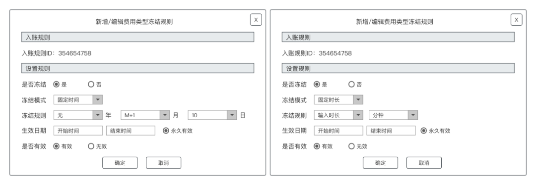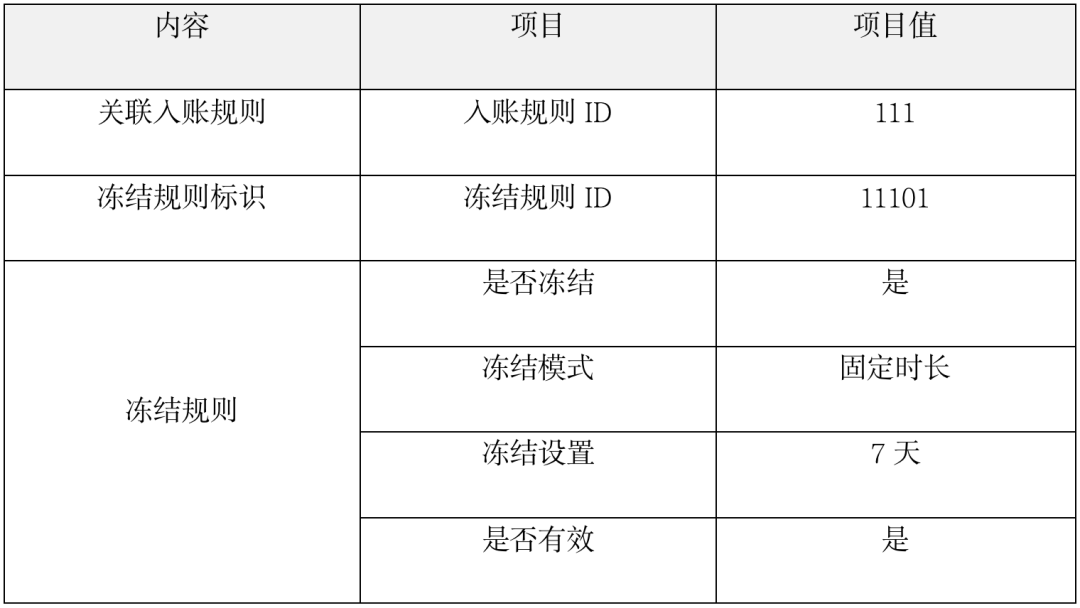 冻结就是一个费用请求入账时暂时冻结起来,计入冻结余额。冻结规则是基于入账规则设置的,也就是这笔入账需不需要冻结,如何冻结,是全部冻结还是部分冻结,所以一个入账规则要关联一个冻结规则,入账的时候就需要同时获取冻结规则;入账规则和冻结规则是一对一的关系,费用类型和入账规则是一对多的关系,因此,费用类型、入账规则、冻结规则三者之间的关系如图所示,陈天宇宙。冻结规则有2部分组成,一个是关联的入账规则;另一个是冻结规则。也就是说在配置入账规则的同时就需要关联性的去配置一条冻结规则,如下表所示。配置规则的新增规则原型如图所示,冻结模式为固定时间和固定时长的规则配置内容不同,具体看图例,冻结规则的配置有以下几个关键点: