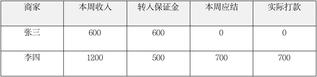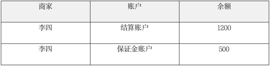 结算单的模式是为每个商家每个结算周期生成一个结算单,记录关键信息,这些关键信息相当于他的账务信息。表所示内容有一个自洽关系:剩余待缴=规则-累计已缴。在商家结算之前,先查看信息表里商家是否还有“剩余待缴”,如果有的话要先清分出一部分进行扣减计入累计已缴,剩余部分结算给商家,如下表所示,示例中,张三的收入需要全部扣掉,而李四的收入足够倒扣,剩余700打款给商家。另一种模式是账户的模式,认证以后平台为每个商家开通一个待缴账户,这个账户的期初余额为0,记录后续缴纳的金额。同样商家的货款结算也采用账户模式,这样商家就有了2个账户。如表中数据,收入已经结算了结算账户中;接下来要将一部分结算款扣减到保证金账户中。查询到李四的保证金规则是1500,所以现在账户还需要再转入1000。因此,要做一个账务处理操作,将其结算账户中的1000转入其保证金账户,会计分录如下所示:
