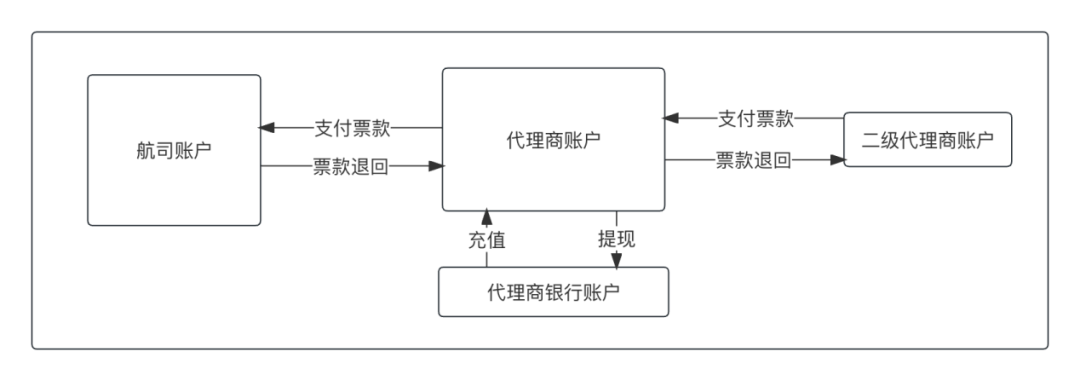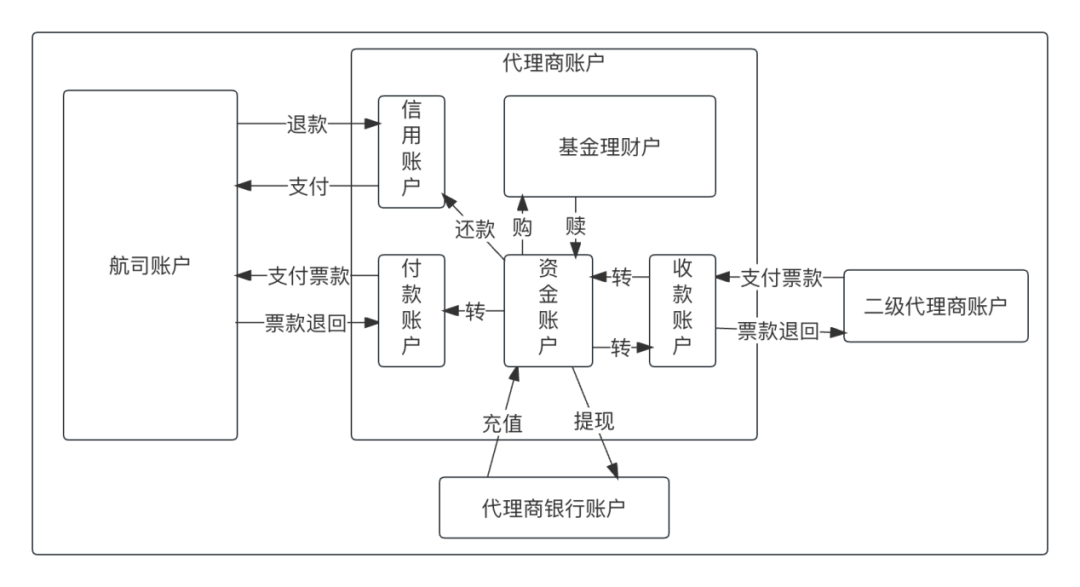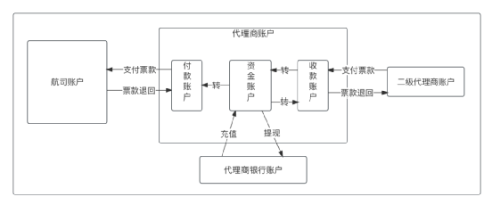 实现资金电子化可以基于交易模型为各参与者建立与交易相匹配的账户体系;以代理商角色为例,分析在上述交易模型的资金行为。我们发现在整个交易模型里有三处存在明显边界的资金往来:代理商与航司的资金往来,代理商与二级代理商的资金往来,代理商与资金开户行的资金往来。所以将代理商的虚拟业务账户进行拆分,通过子账户体现出这层关系,并将账户内资金的流动性通过子账户之间的业务关系完成。环境是变化的,行业也是变化的,痛点也是变化的,在变化的商业环境里必然产生新的变化的交易特征,新的模式,新的方案。