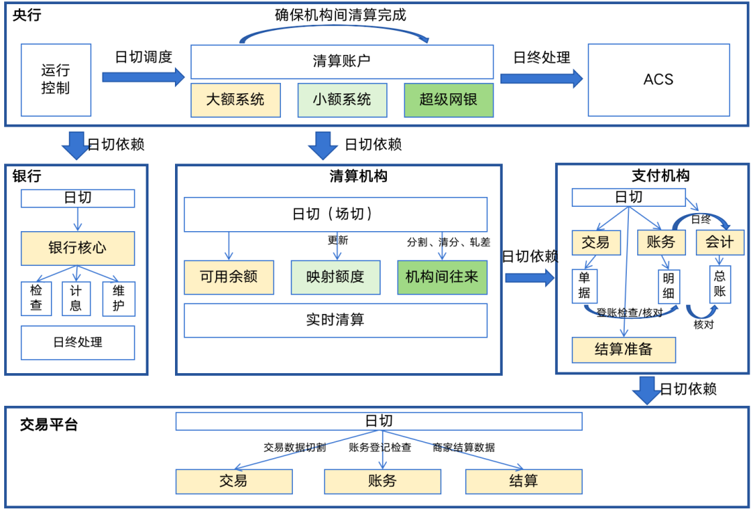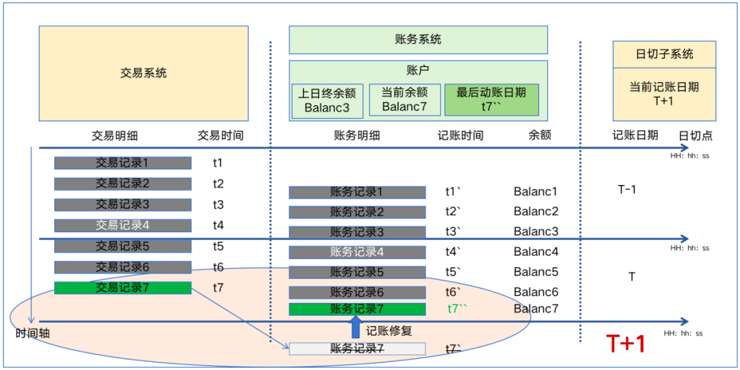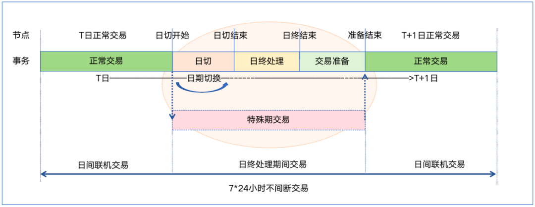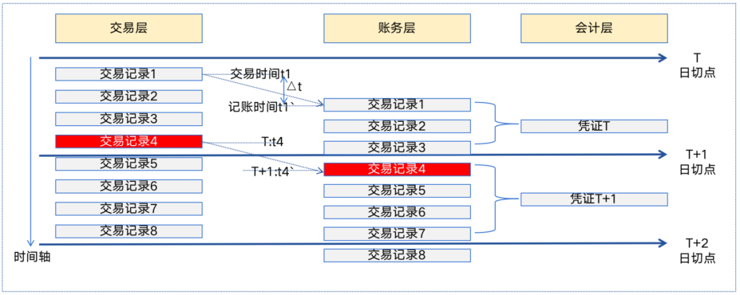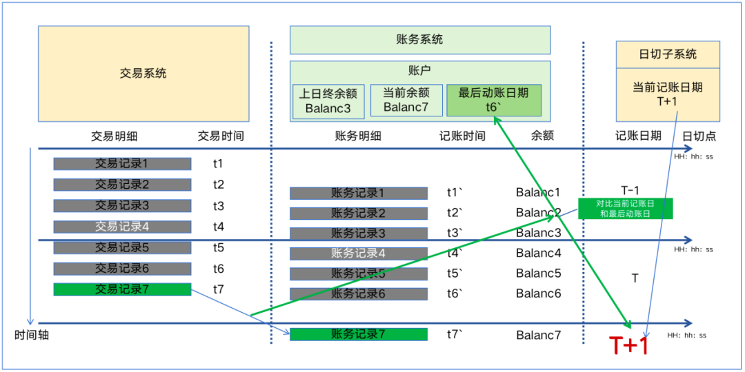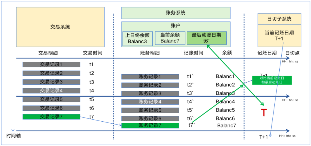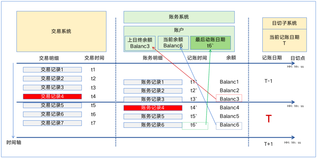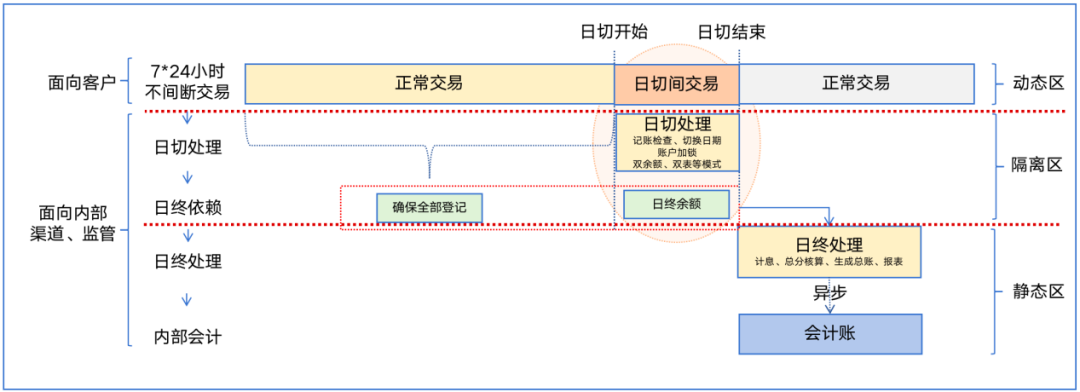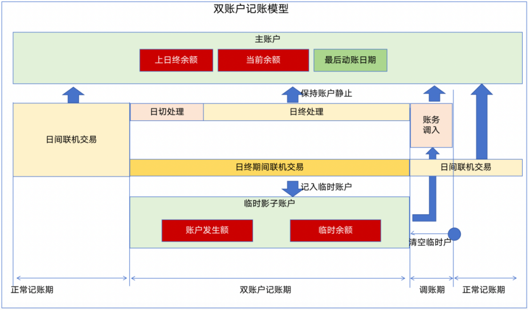 一个子账户解决一个问题,那么更多的问题就可以用更多的子账户去解决;比如代理商资金流动性不足,就有了信贷的场景,就可以为其提供信贷;有的代理商资金充足,可能就有了理财的场景,可以为其提供理财,子账户又可以进行拆分;付款账户拆分出信用账户,资金账户拆分出理财账户。未来还有更多场景,未来还有更多可能,无论遇到何种问题,通过子账户拆分,再拆分,合并再合并,切换再切换,用这种可伸缩的灵活性,变通性,将交易流,支付流,资金流的脉络结构完美的反映和契合,从资金结构中反映出业务结构,让资金管理效率更高,核算更便捷,让支付解决方案更具魔力。对日切这个概念,我想很多人都不陌生,但日切究竟是如何实现的,日切前后及过程中都发生了什么,需要做哪些事情,不同的年代,不同的机构情形下,日切的实现模式会有一些差异,本小节将讲清楚日切的实现原理。所谓日切就是切换到下一个记账日期,这里要先搞清楚一个事情,日切就意味上一个交易日结束,下一个交易日开始,也就是日切总是伴随着日终,二者形影不离。那么介绍日切就必须聊日终处理,我们把它当成一件事来看。为了深刻理解日切模式,先看一下日切的发展史。有些人觉得,我现在就在做账务系统,但是对日切的感知并不明显,如果是这样,那是因为:时代变了,日切的方式也变了,要想深度理解一个事物,就要站在历史发展的视角看它,当前感知不到,只是因为,它变得更加简洁和高效了,不像早些时候那样繁重。支付发展程度越高,效率越高,成本越低,其中就包括日切的处理,日切随着支付的发展,也在变得简单。早期的钱庄,货币是金属实物性质的,做账是手工实现的,加上没有现代会计方法作为记账依据,那么账务登记和管理效率也相对较低,造成两个交易日之间的日终处理工作相对繁琐,可以理解为非常重的“日切/日终处理”的时期。同样,银行也经历了多个时期,例如最早期的手工账时期,用算盘算账,纸质账簿做账务登记,那么日切过程势必要处理的事务也相对较多,而且人力成本较高,用时较长。1979年,国务院批准银行业可以引进外国计算机进行试点,1987年开始,工行、中行、建行开始引入IBM的大型机和业务应用系统,结束了手工记账的时代,开启了信息化进程。很多工作交给了计算机去做,这时候的日终处理效率相比手工账时代就高多了,但是日切和日终的事务依然耦合在一起,需要停止联机交易进行日切和日终处理。这个阶段,每年的12月31号,一年最后一天的日切/年终也就是银行年终决算是最忙的一天,需要进行全年损益结转利润。因为银行的账目很多,例如现金账、日记账、柜员账、网点的账等等都需要实现平衡,一分钱都不能错,这就导致每次年终决算就像打仗一样,全行联动,为确保数据无缺失、准确,需要进行大量的检查。听说每圆满完成一次年终决算,是要庆祝甚至放鞭炮的。而现在的年终决算,相比之前要轻松容易多了,陈天宇宙。现代银行一般都可以提供7*24交易服务,那么银行系统是如何实现即可以7*24小时不间断联机交易,又可以同时进行日切、日终处理的呢?这是这个时期需要重点解决的问题,这个时期的日切可以认为是极轻的日切时代,即然轻,那对它的感知就弱了。这里要掰扯清楚一点,就是虽然现在大部分银行都实现了7*24小时联机交易,但银行依然需要进行日终维护,二者之间并不是冲突的关系,不是说,交易可以7* 24进行,就不休息了,不维护了,只不过是“系统维护”和“7* 24小时不间断交易”可以实现并行。上面讲到了“7*24小时不间断交易”处理是当下的流行,那么系统怎么兼顾实时交易不间断,而日终处理又可以顺利进行呢?就成了这个阶段最重要的课题。二者重点产生耦合的地方是在日切点附近的“实时交易和日终处理”,二者存在依赖关系,例如日终处理需要用到“上日终的静态日末余额”,而实时交易的余额是动态实时更新不停息的。那么,切断二者的耦合而形成轻联系,建立让彼此单独运行的模式,就是突破口。而上一日的日末余额和上一日数据的完整性是日终处理依赖的关键,所以,实时交易要确保能够提供这两个数据的保证即可。常见的模式是双余额模式和双表模式。可以这么理解,将实时交易和日终处理进行隔离,7*24小时实时交易独立运行,而日终处理在另一个区域单独进行,不阻碍也不干扰实时交易的进行,实时交易只需要保证提供日终处理需要的内容即可,也就是所谓的:“实时联机交易+日终批量处理”双模式。这时候,日切和日终的强耦合日切模式,演变到了二者实现隔离的简日切模式,也就意味着,如果交易不需要关注日终,那么日切将变得极其简单。当然对于支付机构、交易平台,这是很容易实现,因为属于弱账户模式,哪怕没有日切和日终的概念,也可以实现数据的自然切割,按照自然日进行处理即可。而对于银行要实现这一点相对复杂,因为存在客户存款计息、贷款计息的管理,对静态余额强依赖,所以即需要维持动态余额的更新,又需要确保静态余额的生成和不变。日切简单的说就是记账日期的切换,变更系统的记账时间;也就是人为的将时间轴根据设定的“日切时间点”切割成一个一个的区间,从前一个区间到下一个区间的过程就是切换的过程;这里的切换时间点就是“日切点”。所以,通过日切点将连续的时间进行了切割,同时也对数据进行