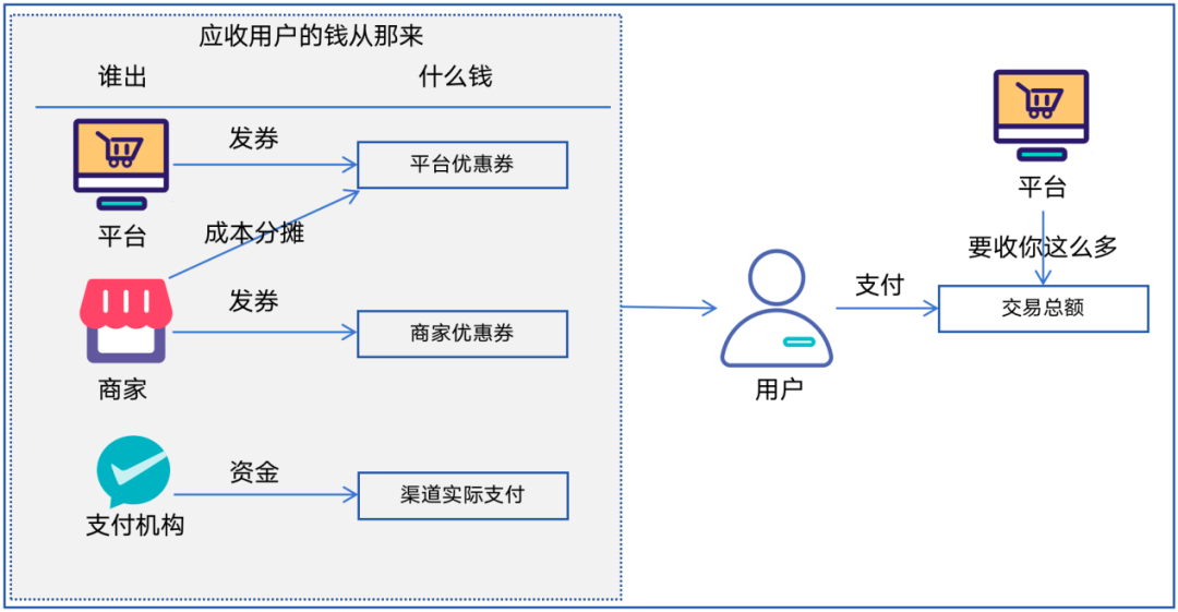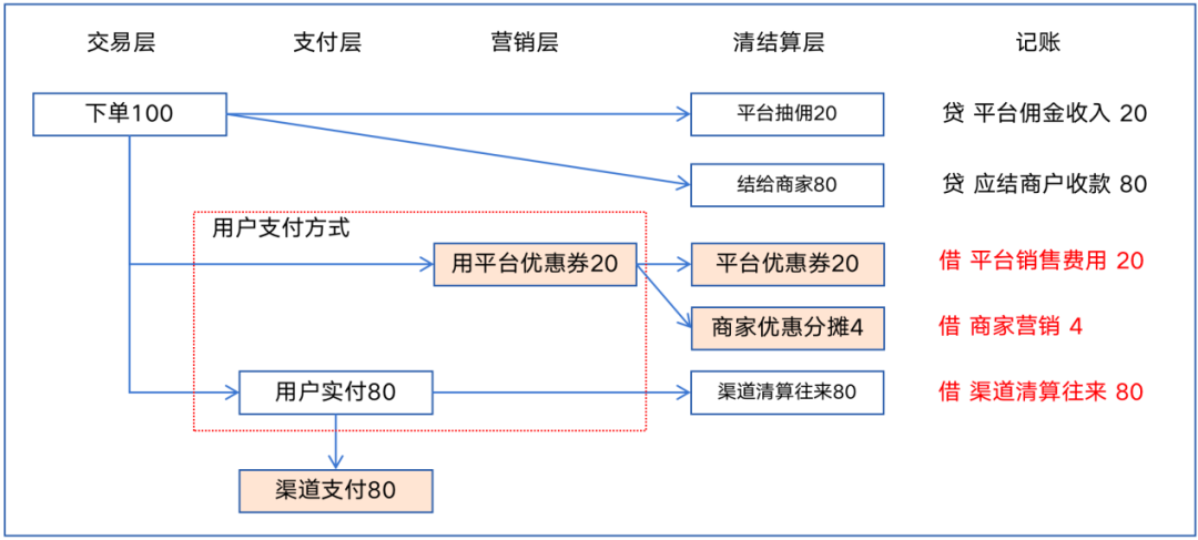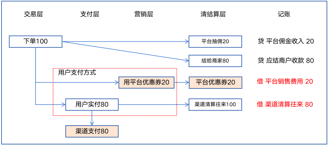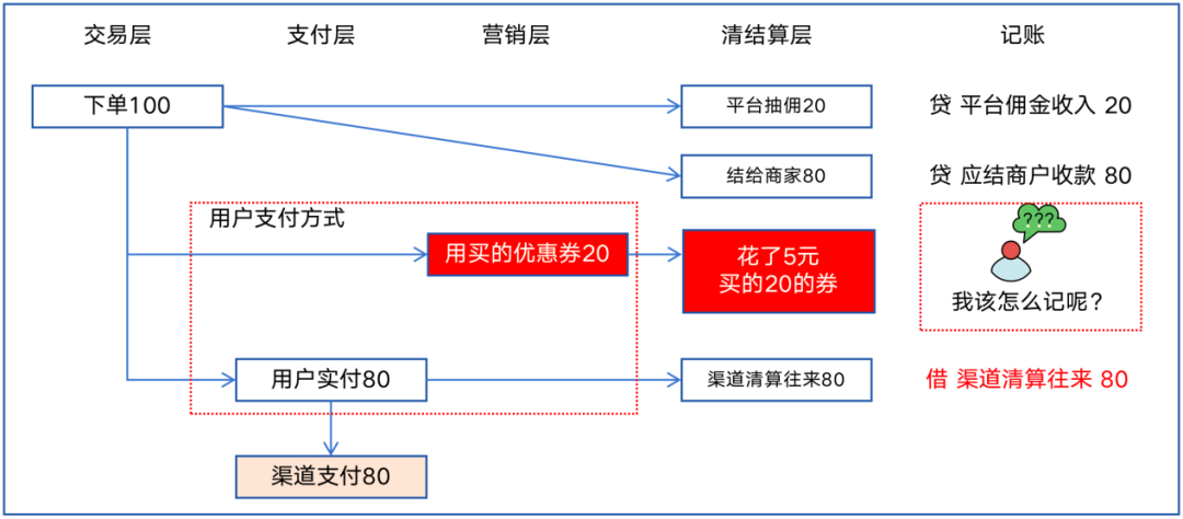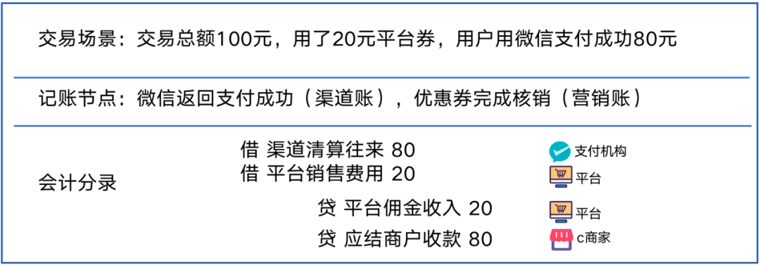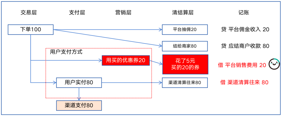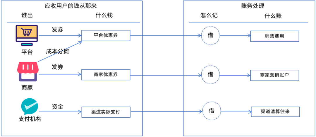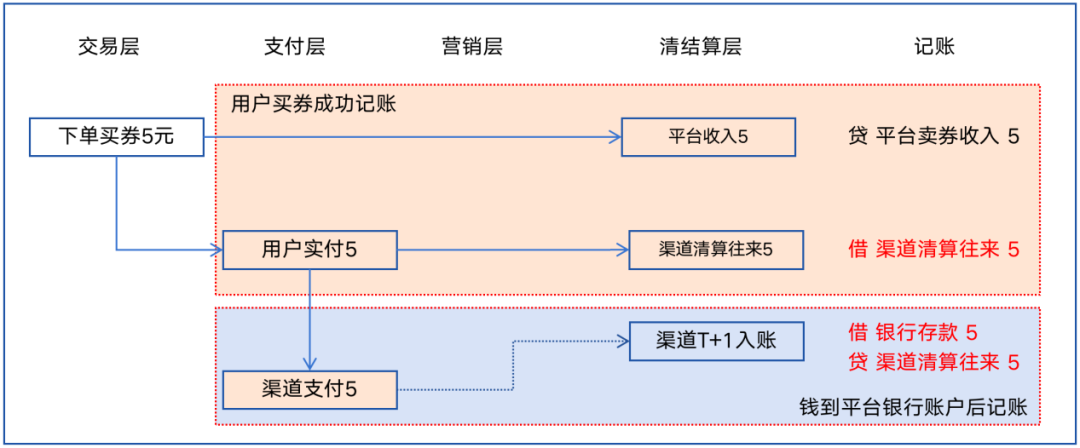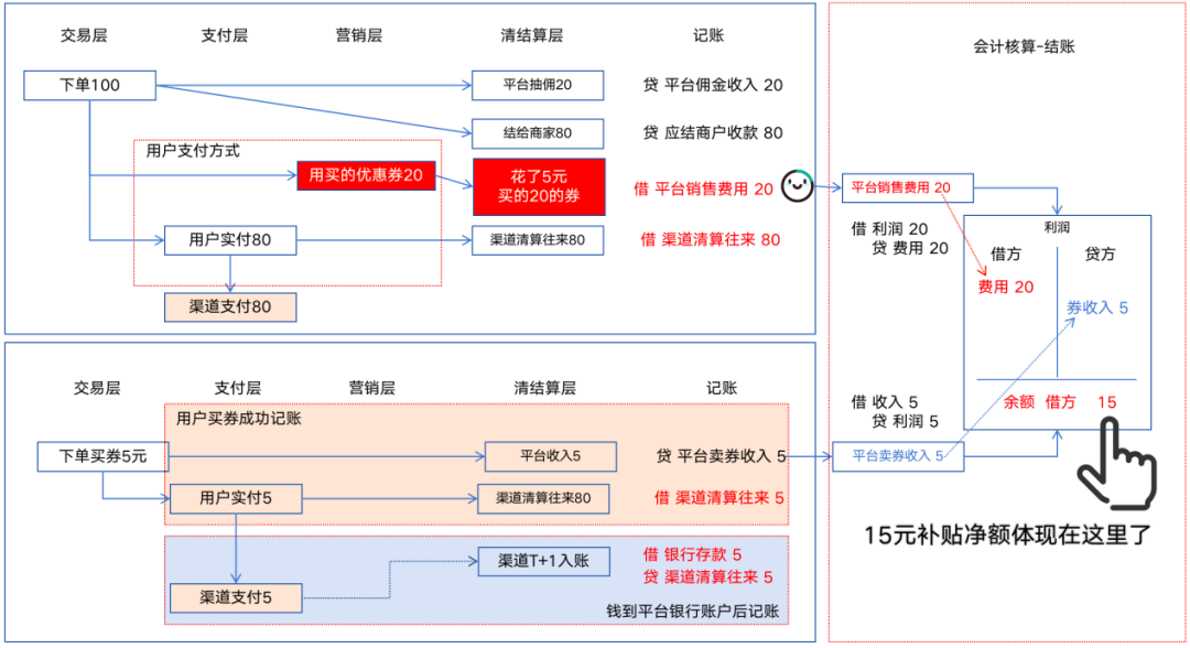 将每个账户设置3个参数:最后动账日期、上日终余额、当前余额。tx是交易登记时间、ty`是账务记账时间,Balance代表账户余额。如图可以看出来最后一笔记账的时间就是最后动账日期,一天最后一笔记账的账户余额就是上日终余额,而最后一笔记账的余额就是账户当前余额。在日期子系统维护着“当前记账日期”。这里要做一个模式的选择,就是上日终余额如何更新,因为当前余额的更新是动账才更新,而日终余额的更新方式有多种,可以动账时更新,也可以选择在日终处理时更新。即当账务有新的入账时,根据“最后动账日期和当前记账日期”来判断上日终余额更新。如果“最后动账日=当前记账日”,即当前入账是当天的入账,只需要更新当前账户余额即可:Balance7=Balance6+本笔发生额,如下图所示,记录7入账时当前记账日期与最后动账日相同,那么说明还没进行日切,则无需更新上日终余额,只需更新账户余额。如果“最后动账日≠当前记账日”,说明已经发生了日切,本笔入账时日切后的第一笔入账,则需要更新上日终余额和当前账户余额:上日终余额更新为当前的账户余额Balance6;并再将当前余额更新为:Balance7=Balance6+本笔发生额;并将最后动账日更新为新的记账日期。这种更新模式下,因为没有动账的情况下上日终余额是不会更新的,所以日终余额的查询也要根据最后动账日和当前记账日期的关系进行逻辑查询。如果“最后动账日=当前记账日”:则直接取上日终余额字段的值即可。如果“最后动账日≠当前记账日”:说明已经完成日切了,但是新的记账日还没有入账,那么账户登记的上日终余额已经不是昨日了,而是更久之前的,此时应该取当前的账户余额作为“上日终余额”。动账时更新上日终余额会造成“上日终余额”的更新不及时,所以可以执行日切时更新上日终账户余额,不管有没有动账发生,每次发生日切都进行上日终余额的更新,而且同时更新最后动账日期,这样每次直接取上日终余额字段即可,无需进行逻辑判断。因为在日终处理过程中,联机交易也在进行,且日终处理需要一定的时间,所以,为了确保联机交易正常对账务的更新,那么依然保持“动账更新余额的模式”。这就意味着,在日切期间有可能出现联机交易和日终处理同时更新账户余额的情形,那么为了解决这一问题,就需要进行账户余额的加锁,谁先发起更新,谁执行,另一方等待,直到锁解除了,等待的一方再执行余额更新。日终处理和联机交易同时更新账户余额时就是冲突期,通过加锁和解锁确保每次只有一方操作账户余额的更新。双余额方法看起来逻辑简单,但是表结构比较复杂,而且按日更新余额模式下,可能存在日终处理和实时处理的账户余额更新冲突,会形成一个排队期,这样就会在日切点造成一定的账务延迟,那么为了确保联机交易和批量处理完全并行处理,而且不冲突,可以采用双账户法。即为每个分户设置一个影子临时账户,来处理日切和日终处理的冲突期的联机交易记账。当系统运行状态进入日切和日终阶段时,临时影子账户开始运行,联机交易实时记账不再更新主账户,而是登记在这个临时账户中。在这种模式下,整个账务处理可以分成3个阶段:正常记账期,双账户记账期,调账期。确保在双账户记账期主账户处于静止状态,临时账户为动态更新状态。双账户记账期:日终操作主账户,更新上日终余额,当前账户余额保持静止,此时期“当前账户余额=上日终账户余额”。该阶段需要注意一点,就是对外的账务服务,例如用户看到的“当前账户余额=主账户当前账户余额+临时账户发生额”。调账期:在这个时期,日间交易开始更新主账户,同时临时账户的临时登记交易也要调账到主账户,其实临时账户的调账跟联机交易更新主账户没有区别,调账完成以后,清空临时账户,开启下一个正常记账期。前面介绍了一个记账漂移的现象,会造成系统间数据切割的不一致。可以通过要求上游系统标记该笔交易的“应入账日期”,来规避记账的漂移。例如在日切运行状态期间的记账,交易系统先执行了日切,那么最后5分钟的交易标记上“应入账时间”,这样,账务系统对于打上了应入账时间的交易执行记账时间修复机制,将其记账时间特殊处理标记为上一个记账日,来规避时间差问题,如下图,T日的交易记录7,在T+1日请求账务登记,被记账修复登记为T日的交易。对于一些支付机构、交易平台,因为不涉及到计息、罚息、贷款预期等的业务处理,对日终余额没有过多依赖,甚至有的机构本身就不存在上日终余额这个数据,那么可以选择不设置日切机制,按照自然日自然日切即可。如果用户下单时用了券应该怎么记账?平台发的券和商家发的券记账有啥区别?如果券需要平台和商家共同分摊呢,怎么记账?假如这张券又是用户用钱买的呢?这么一假设是不是账务处理难度瞬间升高了几个维度,别着急,把逻辑理清楚了,就容易了。这里要建立一个非常明确的认知,交易层记得是平台应该收用户的账以及应该结给商家的账,而支付层记得是平台跟渠道之间应清算的账,理解这一点非常重要。券的本质是补贴给用户的,因此补贴了券,就意味着用户会少支付一些,那么跟渠道之间就会少清算这部分券的金额,但是交易的总额没变,那么券的钱找谁清算呢?——谁发的券,找谁清算,所以,券+渠道支付=交易总额。因此,当用户在交易时