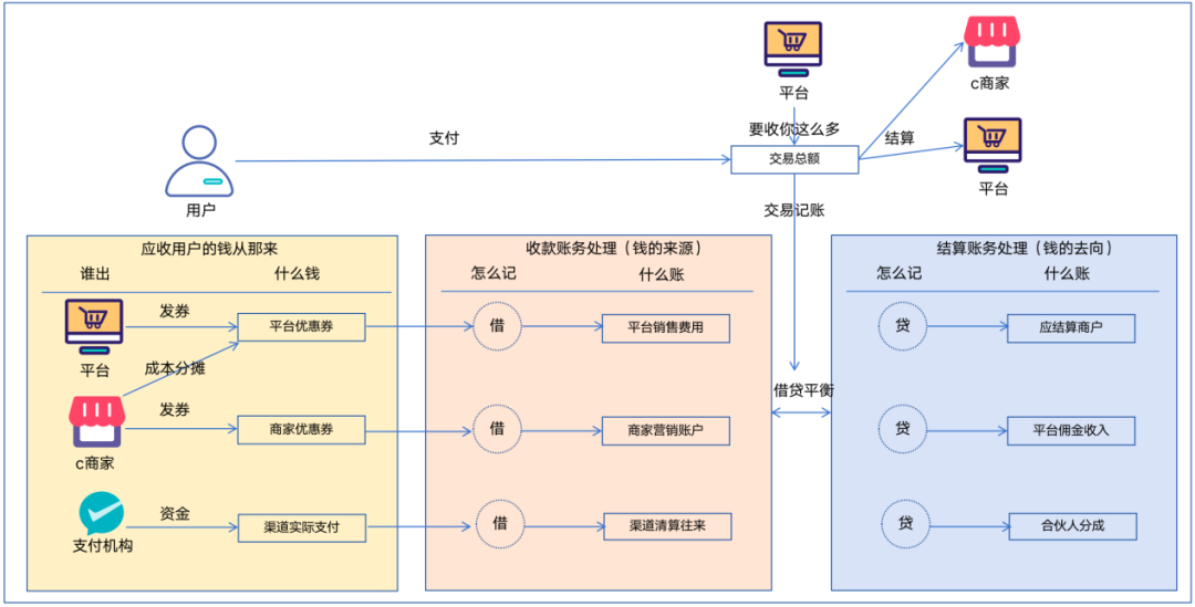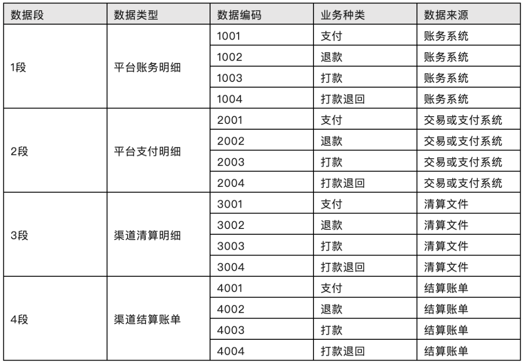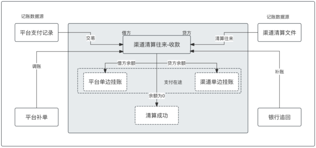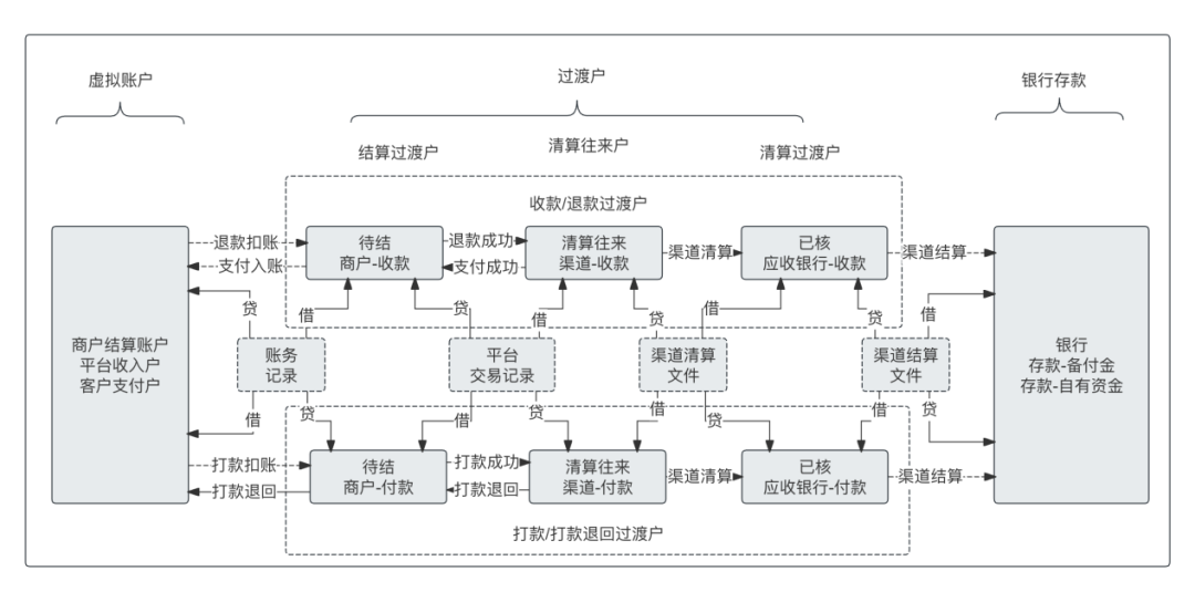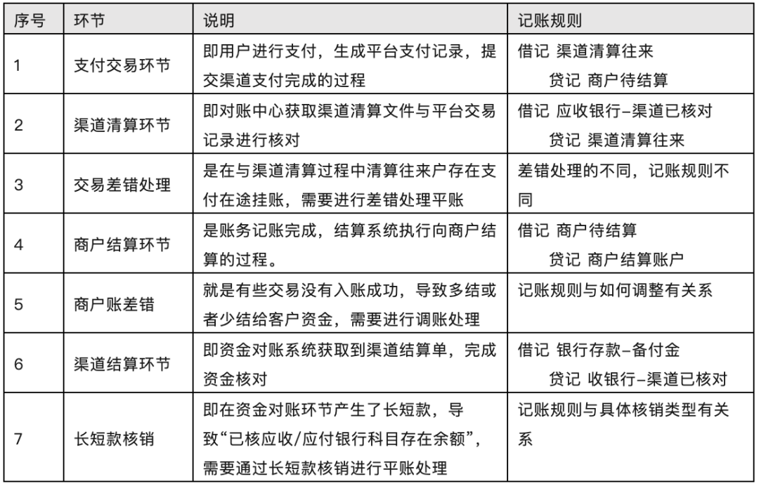 无论是交易还是支付,或者是对账、渠道清算、结算,都离不开各类数据,可以将全链路的最原始数据分成四类,分别是:账务数据、支付数据、清算数据、结算数据。并分别定义为1段数据、2段数据、3段数据、4段数据,如表所示。数据分段以后,从数据编号既可以看出该数据的全量信息,来自那个系统,是什么支付业务产生的数据,在后续凭证规则中就可以基于数据段设置凭证规则,那个数据段的数据生成什么凭证,操作哪些账户,例如2001的支付数据要操作清算收款往来账户和商户待结算账户将所有数据段以及核对差异产生的差错处理数据的账务处理关系绘制出来,就得到了如下图所示的,各段数据源与账务核心的账务处理关系。这么多数据,是如何从业务系统流向账务系统的,系统之间的数据流转关系,数据从各业务系统产生以后经过对账系统、转换中心、计费中心、财务处理中心到最后的会计核心。对账中心从渠道获取清算文件解析出清算数据,并从交易平台获取到交易数据用于交易对账;交易中心推送账务核心进行记账,对账中心的清算数据也会推送至账务系统进行过渡清算类账户的账务处理。交易对账数据和账务数据会按照各段数据的格式要求转换成文件数据,然后推送至成本计费中心,完成通道成本的计算,并在清算数据上绑定结算账户、结算日期等信息,然后推送至财务处理中心准备资金对账。资金对账产生的长短款数据以及长短款核销数据也是新的数据段,会推送至会计核心生成长短款等挂账数据。最后备付金账套的手续费收入和通道成本会结转给财务账套,进行内部资金的核算。至此,整个数据就从业务产生到核算完成,实现了全链条的流转。清结算业务离不开账务和账户,为此,需要设置一套账户,为支付交易和清结算等业务提供账务支持。设置的账户及用途如表所示。整个账户体系包含5套账户,分别是商户结算户、结商户账户、清算往来户、已核银行收付、银行存款,其中共同类账户又分成了收款类和付款类,这样的账户设置共同完成了基于支付交易的向内结算和向外清算的支付业务框架有了上述科目以后,要想搞清楚账务处理,需要搞明白账务处理的要素和基础原理。账务处理要素:账务处理的要素就是要做账务处理,需要关注那几个维度的信息,主要是5个维度:什么业务、什么时候记、用什么数据记、记账规则是什么。什么业务:常见的业务种类有收款/退款、打款/打款退回、差错即差错处理、长短款及核销、客户账务调整、结算结转财务等等;什么时候记:即记账的时机,如支付成功、打款成功、退款成功、渠道清算对账成功、资金对账成功、账务记账成功等等;用什么数据记:用于记账的数据有支付数据、账务数据、清算数据、结算数据、差错数据、长短款核销数据等;记账规则是什么:有了记账数据,如何记账就需要记账规则,记账规则内容主要包括借贷方向以及涉及到的账户。账务处理的基础原理就是通过借贷记账法利用业务数据操作相应的账户,如上图中所示的那样,主要的记账数据是支付交易记录、账务记录、渠道清算记录、渠道结算记录,他们相应的借贷符号也如图中所示,例如收款的支付记录要借记清算往来收款、贷记待结商户账户,以此类推。同样也要特别关注差错类的记账,包括交易类差错、资金处理类差错、客户调账了差错等。因为过渡账户的借方和贷方使用的是2份相关的数据源,因此其余额反映了这2份数据源之间的差异,因此当过渡户存在余额时,则意味着存在在途,主要有三大在途:客户在途、支付在途、资金在途,在途可以理解为各类挂账,各类差错处理的记账就是抹平挂账。