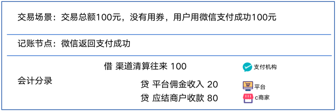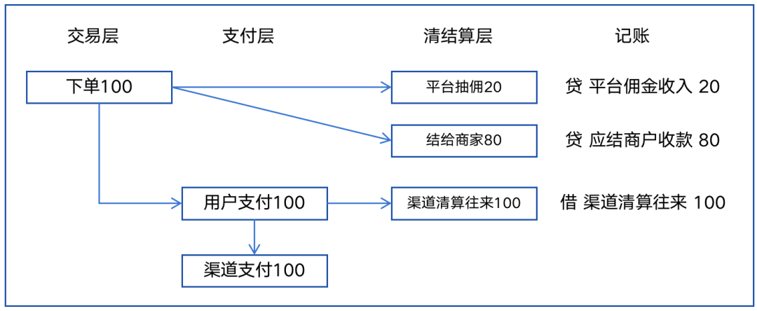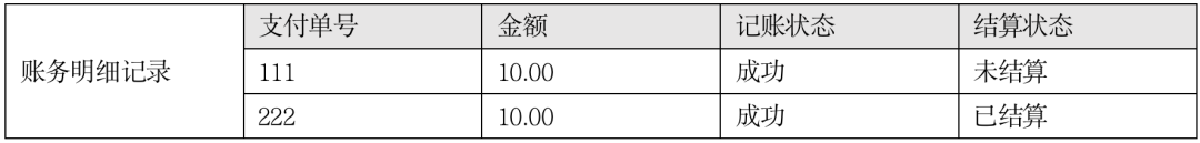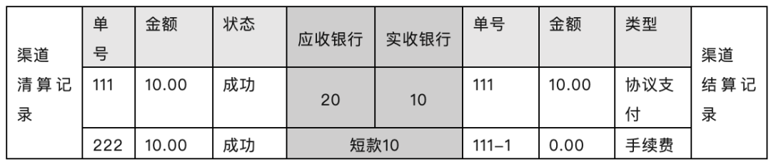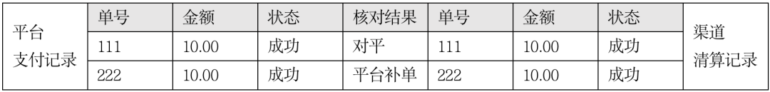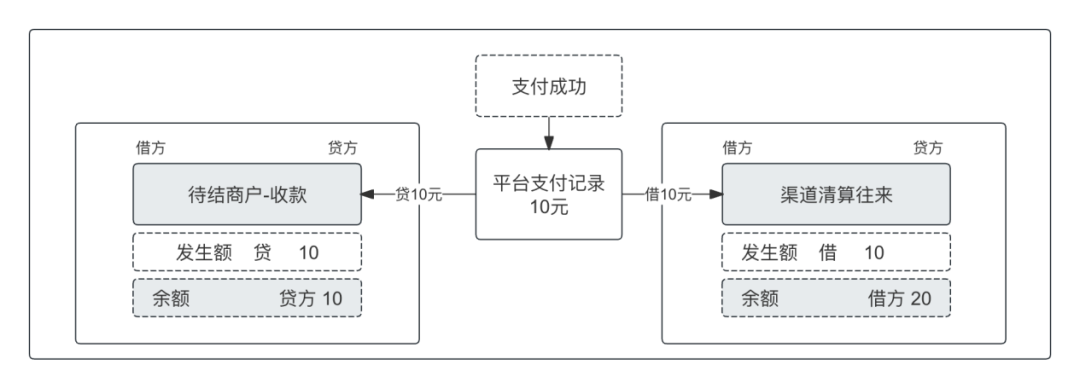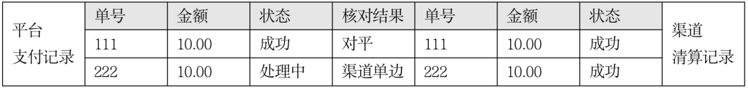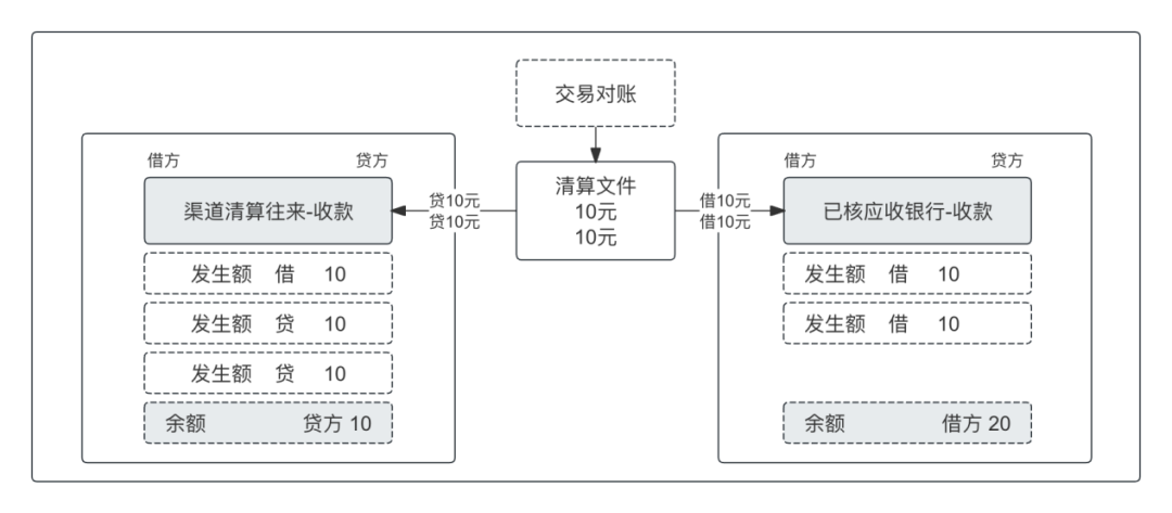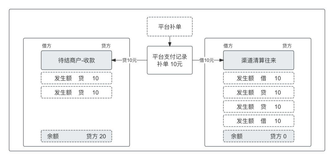 案例:平台收了2笔钱,都是10元,渠道T+1结算,给商户也是T+1结算,然后各环节数据情况及账务处理如下:用户支付了2笔,各10元,成功了1笔,另一笔支付处理中,支付核心生成了相应的支付数据交易驱动账务进行记账,以支付数据为记账数据,借记渠道清算往来,贷记待结算商户对账中心获取到渠道清算文件以后,与平台记录进行核对,渠道清算成功了2笔,因此核对结果如下表所示,出现了一笔渠道单边。其中清算文件数据做为渠道清算记账数据,借记“已核对应收银行”,贷记“渠道清算往来”,记账情况如下可以看出,清算完成以后,渠道清算往来-收款存在贷方余额,也就是交易对账的渠道单边造成的。经排查,是平台的支付系统状态更新异常,在对账中心进行了“平台补单”的差错处理,原来的处理中的支付状态,更新成了成功补单成功的支付记录将驱动账务再次记账,因为平台补单的数据属于平台支付记录,因此,其账务处理规则与平台支付记录的账务处理规则相同从图中可以看出来,此时待结算商户20元,与渠道清算成功,应收渠道20元,商户结算户和银行存款户还没有余额。假设,开始支付成功的一笔交易是没有完成账务记账的,而次日对账补单成功的交易完成了客户记账,那么也只有补单成功的完成了向商户的结算基于补单成功的交易,推动账务完成了记账,在T+1执行结算以后,完成了向商户的结算可以看到待结算商户-收款,存在贷方余额,即应结商户的在途资金,这是因为存在交易未入账的情况。触发交易发起补入账操作,补入未入账的交易记录,如表,状态是未结算