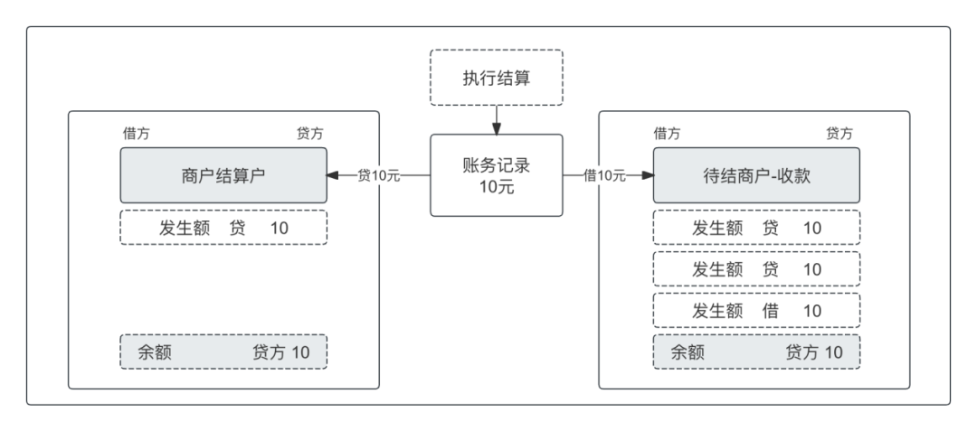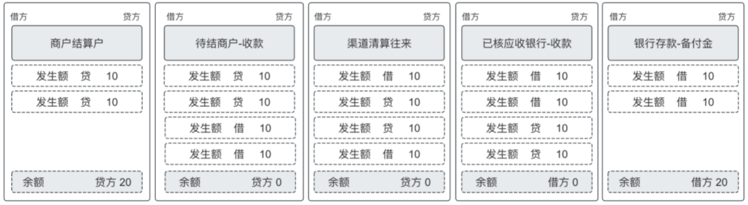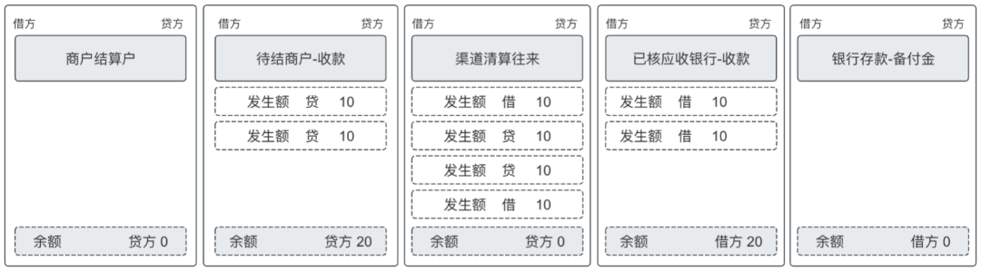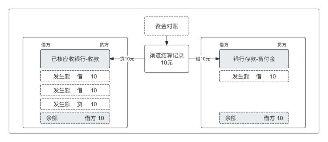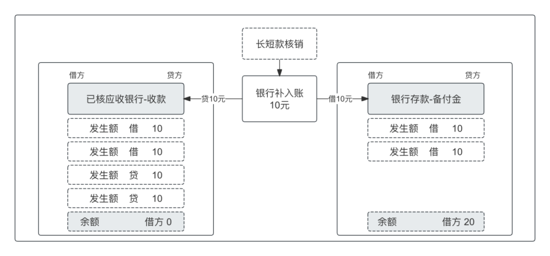 资金对账模块获取到银行结算账单以后,进行资金对账,假设渠道结算文件记录只有一笔,因此在资金对账时出现了短款资金对账结果产生了10元的短款,系统会自动生成长短款记录 可以看出来,渠道资金对账以后,已核应收银行存在借方余额,即有短款挂账,这个与短款记录是一致的,因此过渡户科目余额的反映与对账结果的反映含义是一样的。经人工排查,收单账户已经完成了资金入账,是结算文件数据丢失,因此对短款进行“银行补入账”的核销,数据如表 至此,就完成了收款清结算的全部环节的账务处理了,涉及到的全部账户的记账情况如图所示。可以看出通过这5组账户的借贷账务处理,完成了从交易到内外清结算的全链路核算以及最后的记账,中间过渡户的最终余额为0,代表着完成了渠道的清算往来核算以及商户的结算核算。通过该账户体系可以非常高效和准确的实战清结算业务的全局处理。