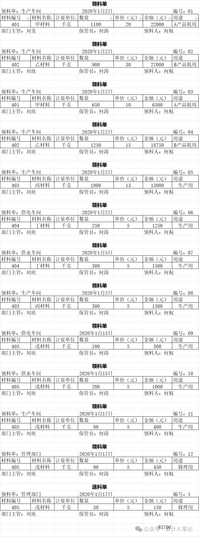 在制造业中,材料领用核算与成本分配是成本会计的核心工作之一,直接关系到产品的成本计算和企业的盈利状况。本文将结合一个实际案例,详细介绍实际成本法下的材料领用核算流程,以及如何通过编制材料费用分配表和完工产品成本汇总表来准确计算产品成本。仅供参考,具体还得结合工厂实际生产流程考虑多种原因方方面面。 一、材料领用核算概述材料领用核算主要包括直接材料、直接人工和制造费用的核算。直接材料是指能够直接计入产品成本的原材料,如家具厂生产柜子、椅子时所用的木头、木板等。直接人工则是指直接参与产品生产的工人的工资和福利。制造费用则包括生产过程中的间接材料、间接人工和其他制造费用,如油漆等辅助材料和车间管理人员的工资。 在实际操作中,企业通常会根据领料单等凭证来汇总原材料费用。领料单应详细记录领料部门、领料人、领料日期、材料名称、规格、数量等信息,以便后续核算。