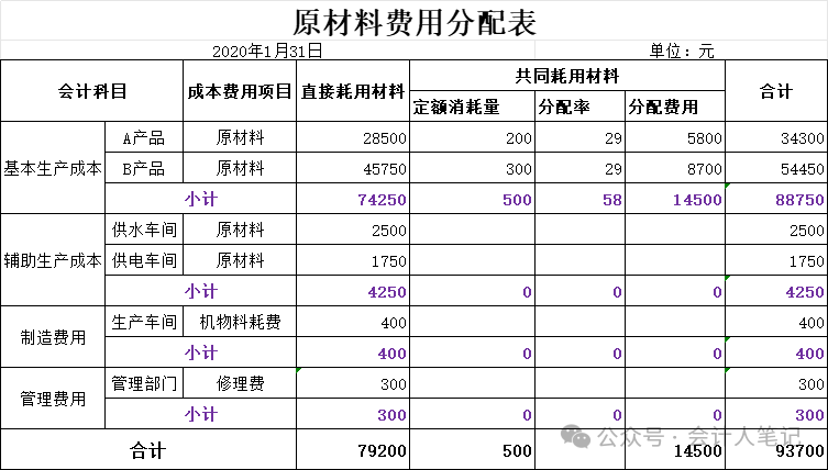 三、完工产品成本汇总表的编制在编制完材料费用分配表后,企业还需要编制完工产品成本汇总表,以反映各产品的总成本和单位成本。完工产品成本汇总表应包括直接材料、直接人工和制造费用等成本项目。 以牛氏股份有限公司为例,假设本月A产品的直接人工费用为3000元,制造费用为2000元;B产品的直接人工费用为4500元,制造费用为3000元。则A产品的总成本为5800(直接材料)+3000(直接人工)+2000(制造费用)=10800元,单位成本为10800/200=54元/件;B产品的总成本为8700(直接材料)+4500(直接人工)+3000(制造费用)=16200元,单位成本为16200/150=108元/件。 最后这个完工产品汇总表留给在座的各位,感兴趣的可以评论区留言