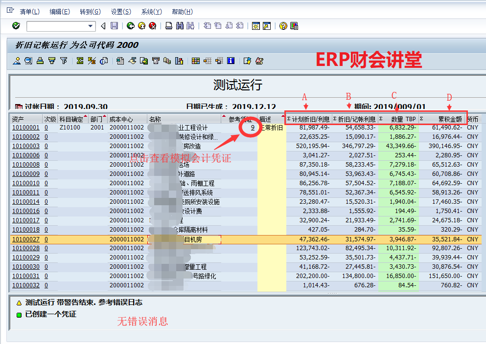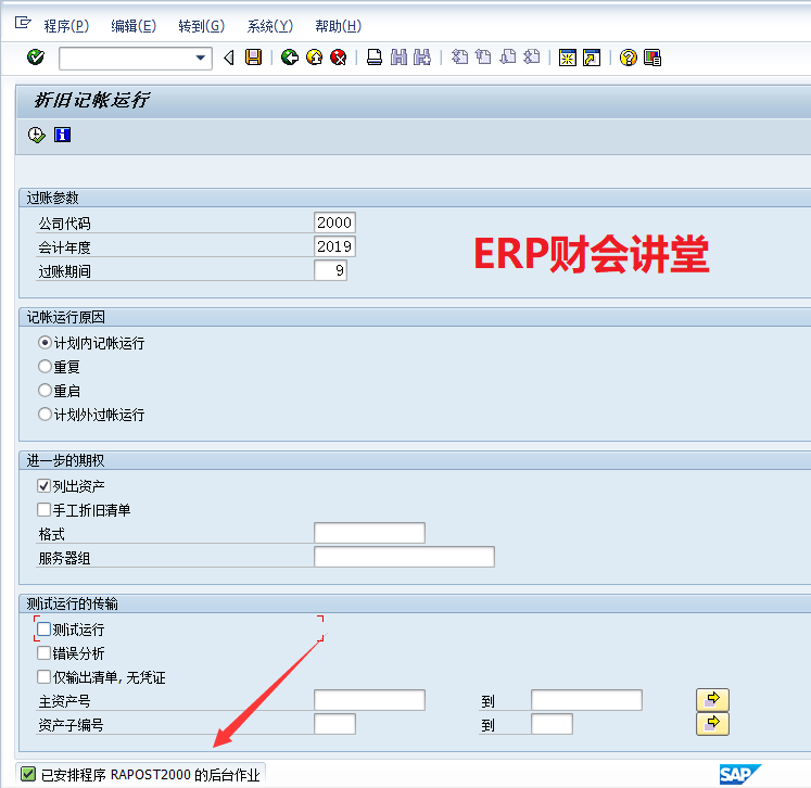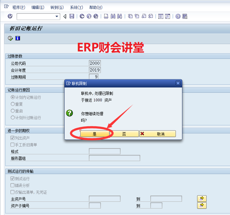 运行资产折旧是财务必备的月度工作,一般在月底执行。SAP中运行资产折旧必须作为后台作业执行,并且可以将其定义为周期性作业,每月最后一天定时执行。本文介绍SAP中运行资产折旧的具体操作。一般测试运行无误后再正式运行,点击红圈中的图标执行测试运行:联机处理时系统默认最多处理1000条数据,如果数据量很大可以后台执行,选择“是”,继续执行。测试运行如果有错误,根据提示选择菜单“转到->错误日志”查看错误原因如下: