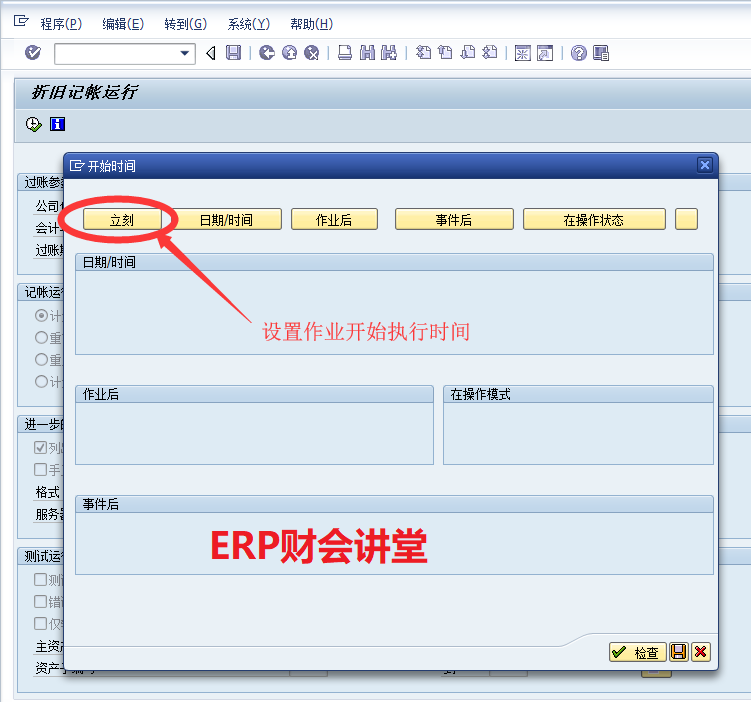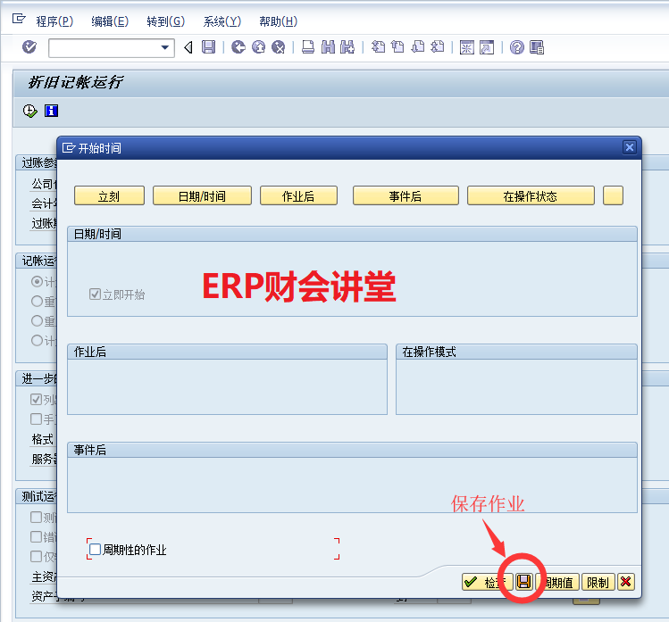 本例中,系统提示9月份账期没有打开,将财务账期打开后,重新测试运行结果如下:确认测试运行无误后,返回到AFAB初始界面,执行正式运行。AFAB运行资产折旧必须作为后台作业,不能直接在前台执行。取消“测试运行”选项,然后点击菜单栏的“程序”,选择“后台执行”,设置后台作业。选择输出设备,一般选择LP01即可(系统会将后台作业执行的日志输出到所选设备,以便分析执行结果),回车进入下一步。在此界面设置后台作业开始执行的时间,选择“立刻”(也可设置在某一时间开始执行)。然后保存作业,系统提示“已安排程序的后台作业”。在上图中可以将后台作业可定义为周期性作业,设置为每月最后一天自动执行。