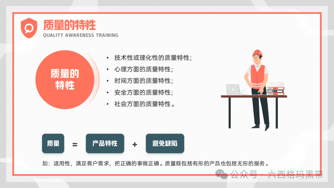 质量已成为企业持续发展和赢得客户信任的关键因素。质量意识,作为质量理念的具体体现,不仅关乎产品的优劣,更直接影响到企业的声誉、市场份额乃至生存与发展。因此,加强员工的质量意识培训,对于提升企业整体质量管理水平、促进企业文化建设具有重要意义。我们来探讨质量意识的重要性、质量的基础知识、对质量的不同理解、质量的意义以及质量的特性,旨在为员工提供全面而深入的质量管理知识,促进质量意识的提升。 质量意识的重要性质量意识是质量理念的表现形式质量意识是指员工对质量的认识、态度和价值观,它直接指导着员工在日常工作中的行为选择。一个拥有强烈质量意识的员工,会自觉地将高质量标准融入到每一项工作中,从源头上减少质量问题的发生。质量意识是企业文化的重要组成部分,它体现了企业对质量的重视程度和对顾客需求的关注。 控制质量行为质量意识能够引导员工遵循既定的质量控制流程和规范,确保每个环节都达到预定的质量标准。通过培养员工的质量意识,可以形成一种自我约束和相互监督的机制,有效降低不良品率,提升产品整体质量水平。 质量意识受客观实践活动影响和制约质量意识并非凭空产生,而是基于实际工作中的经验积累和对质量问题的深刻认识。企业通过组织质量培训、案例分析、现场指导等活动,可以帮助员工树立正确的质量观念,同时,员工在实际操作中的反馈和体验也会进一步丰富和深化其质量意识。 质量基础知识质量的定义质量是指一组固有的特性满足要求的程度。这一定义强调了质量的主观性和相对性,即质量的好坏取决于产品或服务是否满足了预定的要求或期望。这些要求可能来自顾客、法律法规、行业标准或企业内部标准等。此外,质量的概念广泛,涵盖了所有可单独描述和研究的事物,无论是有形的产品还是无形的服务,都有其质量属性。 质量的意义