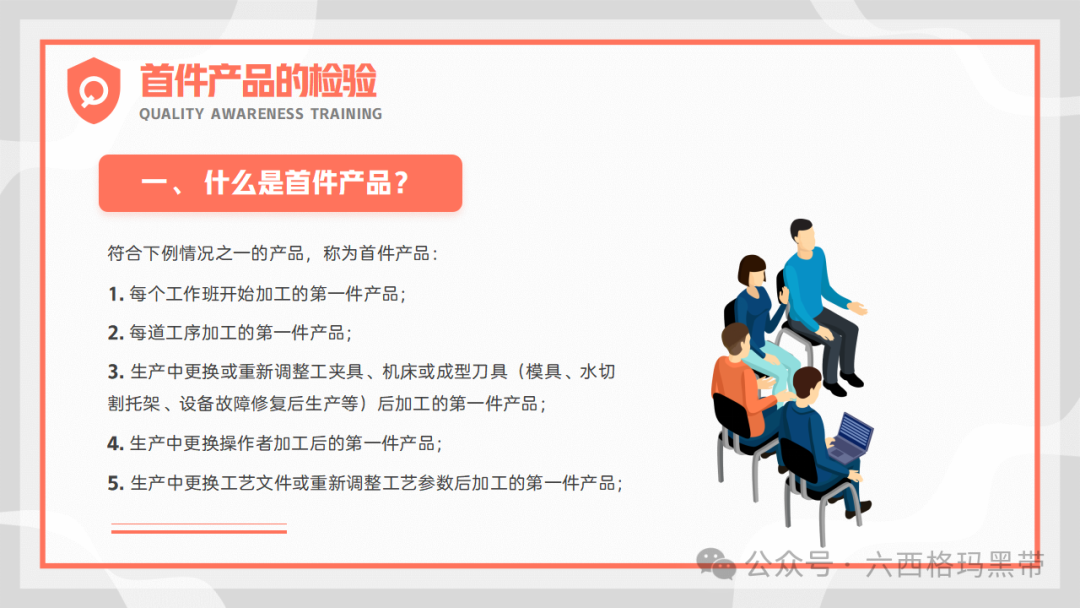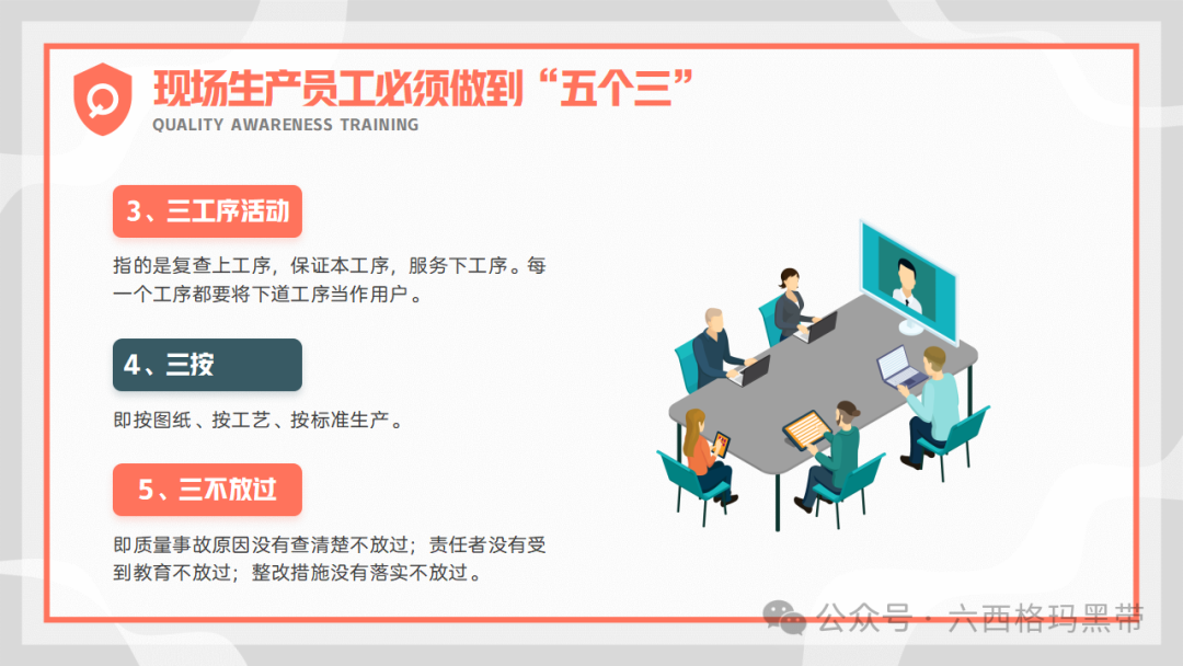 不合格品的处理及产品标识生产过程中发现不合格的处理在生产过程中,一旦发现不合格品,员工应立即停止生产,并对生产过程进行检查和分析,查找原因并采取有效的纠正措施。对于无法改正的不合格品,应及时报废并处理,防止其流入市场或影响下一道工序的生产。同时,不合格品的处理应经过质检人员的确认和审批,确保处理的合理性和合法性。 产品的标识及可追溯性为了确保产品的质量和可追溯性,企业需要对产品进行明确的标识。标识应包括产品的名称、规格、型号、生产日期、批次号等信息,以便于追踪和追溯。同时,企业还需要建立健全的记录制度,对生产过程中的每一个环节进行详细的记录,确保记录的真实性和完整性。记录应包括原材料的使用情况、生产过程的操作情况、产品的检验情况等,以便于在出现问题时能够及时查找原因并采取相应的措施。 此外,企业还应根据产品的不同状态进行标识,如未检、已检合格、已检不合格、已检待处理等。这种标识有助于员工在生产过程中及时识别和处理不同状态的产品,防止混淆和误用。 员工需具有质量意识现场生产员工是产品质量的直接创造者,他们的质量意识直接关系到产品的最终质量。因此,员工必须深刻理解并践行“五个三”的质量管理理念,以确保产品质量的持续提升。 三自一控三自一控指的是自检、自分、自纠以及控制一次自检的正确率。员工在生产过程中,应主动对自己的工作进行自检,确保每一步操作都符合质量标准;同时,要能够自我分辨出合格与不合格的产品,对不合格品进行及时纠正。此外,还要努力提高一次自检的正确率,减少重复检验和误判,提高生产效率。 三检制三检制包括首检、互检和专检。首检是在生产开始时对首批产品进行检验,确保生产过程的稳定性和准确性;互检是在生产过程中,员工之间相互检查对方的产品,形成相互监督、相互帮助的机制;专检则是由专业的质检人员对产品进行最终的检验和确认,确保产品质量的合格性。三检制的实施有助于形成全方位、多层次的质量监控体系。 三工序活动三工序活动强调员工在生产过程中应关注上工序、本工序和下工序的质量情况。通过复查上工序的产品,可以确保接收的原材料或半成品符合质量要求;在本工序中,要严格按照质量标准进行操作,确保生产出的产品合格;同时,还要关注下工序的需求,为下工序提供合格的产品和必要的帮助,形成全面的质量管理链条。 三按三按是指按图纸、按工艺、按标准进行操作。图纸是产品设计的依据,工艺是产品生产的流程,标准是产品质量的衡量尺度。员工在生产过程中,必须严格遵守这三者的要求,确保生产过程的规范性和准确性。 三不放过三不放过是对质量问题的处理原则,即对出现的问题不查清不放过、不处理不放过、不改进不放过。这一原则要求员工对质量问题保持高度的警惕性,一旦发现问题,要立即进行深入的调查和分析,找出问题的根源,并采取有效的措施进行解决和预防,确保问题的彻底解决和不再发生。 首件产品的检验什么是首件产品?首件产品是指每批产品或每次生产开始时的第一件产品。由于首件产品代表了整个生产过程的开始,因此其质量状况对整个生产过程具有重要影响。 什么是产品首件检验?产品首件检验是对首件产品进行全面的检查和验证的过程。通过首件检验,可以确认生产过程是否稳定、准确,以及产品是否符合质量要求。首件检验通常由专业的质检人员或生产负责人进行,检验内容包括外观、尺寸、性能等多个方面。 什么是产品首件三检?产品首件三检是指在首件检验过程中,进行三次不同层次的检验。第一次检验由操作者自检,确保产品符合基本的质量要求;第二次检验由班组长或质检员进行互检,对产品的关键特性进行再次确认;第三次检验由专职质检员进行专检,对产品进行全面的质量评估。通过三次检验,可以确保首件产品的质量符合标准和要求。 什么是产品?产品是指经过生产、加工、制造等过程而得到的具有特定形状、性能、用途和价值的物品。在质量管理中,产品不仅指最终的成品,还包括生产过程中的半成品、原材料等。 错误认识纠正品质不是检验出来的,而是生产出来的这一观念强调了生产过程控制的重要性。检验只是对产品质量的验证手段,而真正的质量是在生产过程中形成的。因此,企业必须重视生产过程的每一个环节,确保每个环节都符合质量标准,从而生产出高品质的产品。 小问题不容忽视在生产过程中,一些看似微小的问题可能会逐渐累积并演变成大问题,甚至导致整个生产过程的失控。因此,员工应具备敏锐的观察力和判断力,及时发现并处理小问题,防止其演变成大问题,确保生产过程的稳定性和产品的可靠性。 ISO9000标准及其精神ISO9000标准是国际标准化组织制定的一系列质量管理标准,旨在帮助企业建立和完善质量管理体系,提高产品质量和服务水平。 ISO9000标准的核心要素