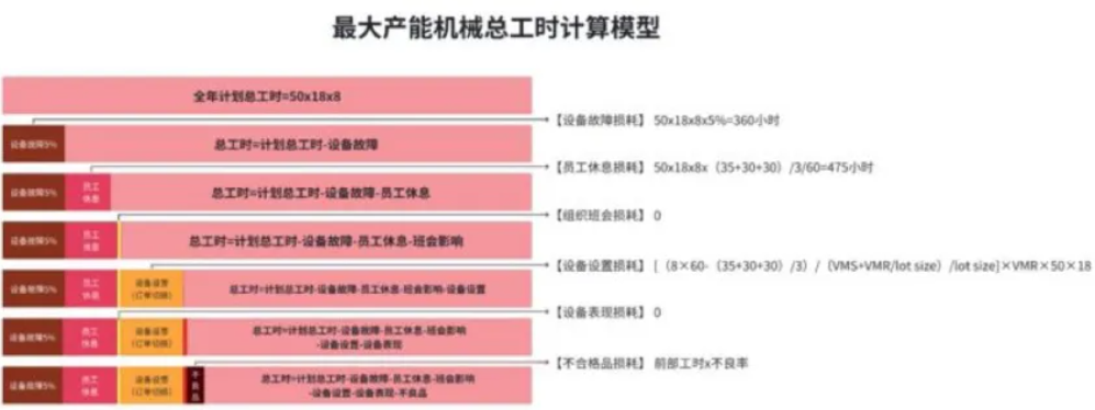 NPV产能计算 在NPV计算过程中有一个极其关键的信息就是产能和工时的计算,其中产能就是要计算新投资的装配单元一年最多可以生产多少件产品,即最大产能,另外一个就是要计算技术实际产能工时(TRC)。 最大产能,顾名思义就是要算一年时间内,生产有效合格产品的最大量。在项目前期进行工艺和投资的评估中,就基本定义好了每件产品的生产工时,所以只要计算出全年生产的总工时,就变成了三年级的工程问题,总工时除以单件工时,就能得到最大产能。 而生产总工时的计算逻辑也很简单,就是先统筹计算全年排班总时长,然后再减去工人休息,设备维护,不良品等损耗就是生产总工时,这个就是生产总工时计算的底层逻辑。 1、全年计划总工时 项目前期规划产能的时候,对于任何一台新设备或者新线体,最合理的班次排布就是按照一天三班,每周五天,周末双休的原则,而出于降本增效的考虑,为了能够更大化的实现投资价值,我们在进行产能评估时,按照一天三班,每周六天,即每周按照18个班次进行设计。 全年时间去掉假期休息后,全年度约有50个工作周,按照每周18个班次,每班工作8小时计算,最终计算得出单台设备的全年计划总时长为7200小时。 而这7200小时,就相当于全年可用于生产的最多的时间,后续所有的损耗都将在此基础上进行删减。 2、损耗:设备有效利用率 人吃五谷杂粮,总会有头疼脑热的时候,设备也不例外,任何的设备无论新旧,长时间的运行也会出现各种各样的故障问题,也就是我们常说的岩机。设备一旦出现故障,就会停止工作,算好计划时长。 为了计算这一部分损耗,我们定义了设备有效利用率(一般为 95%)这样一个概念: 设备有效利用率=(计划总时长-设备故障总时长)/计划总时长x100% 去除这部分损耗之后,设备计划总时长减掉5%,剩余6840小时。 3、损耗:工人休息时间 工人上班除了吃饭之外,还有用餐时间以及休息时间,对于一些手动装配单元,当人吃饭或休息时,设备是无法进行生产的,所以也会产生一部分损耗。 对于休息和用餐时间的定义,目前是这样安排的: 按照每天三班进行排产,每天分白/中/夜三班制,白班35min,中班30min,夜班30min。为了便于计算,会将休息时间均分到每个班次内求平均值。所以这部分的损耗就是用全年总班次乘每个班次的休息时长,即: 工人休息总时长=50周/年x18班/周x[(35+30+30)/3/60] 注意,如果是自动化设备在员工休息时依然可以保持工作状态,这部分损耗可忽略不计。 4、损耗:班会时长 每个班次开始和结束时间都会有班会的安排,班会期间,操作工人依然无法正常生产,势必会对生产造成影响。 但是为了降低这部分风险,我们规定交接班过程需要保证正常排产,方法就是下一班次提前到场,上一班次结束开班会的时候,下一班次直接入场作业。这样就避免班会对生产的影响。所以这一部分损耗为0,忽略不计。 5、损耗:设备准备时长 实际生产过程中,都是按照订单批次进行生产的,每一个批次之间,因为产品型号,加工程序以及工装夹具的不同,都会有切换,更换程序和相应的工袭央具,就像是我们做饭时,炒完一道菜之后,在下道菜之前总是要刷锅一个道理。 所以设备准备时长就是要看一个班次内的订单切换次数,每切换一次都会有一次设置时间产生。而计算切换次数就是用单班次生产总数除以生产批量即可,再往上推计算单班次生产总数,就是用单班次生户总时长除以单件产品生产时长即可。 其中: 单班次生产总时长 = 计划时长-休息时长=(8x60-(35+30+30)/3) 单件产品生产时长 = (VMS+VMR/lot size) 所以: 单班次生产总数 = 计划时长-休息时长=(8x60-(35+30+30)/3)/(VMS+VMR/lot size) 单班次切换次数 = 计划时长-休息时长(8x60-(35+30+30)/3)/(VMS+VMR/lot size) /lot size 单班次设备准备时长 = 切换次数x准备工时=[(8x60-(35+30+30)/3)/(VMS+VMR/lot size) /lot size]xVMR 全年设备准备总时长 = 单班次设备准备时长x全年总班次数量。 即:[(8x60-(35+30+30)/3)/(VMS+VMR/lot size)/lot size]xVMRx50x18 6、损耗:设备表现 设备受现场电力,气压,温度等影响,实际效率会有所贬值,可能只能发挥九成功力,甚至更低,为了计算这一部分算好我们定义了一个设备表现比值,即设备实际转速与标准转速的比值。 通常情况下,我们默认为设备100%运行,但凡是购买设备就会为设备的正常运行创造更合适的环境,所以这部分算好也可以忽略不计。 7、损耗:产品质量合格率 我们在前面就已经讲过,设备产能就是要计算设备全年最多可以生产合格品的数量,如果设备全年生产的产品都很快,但是每件产品都不合格,那快就没有任何意义,所以我们定义了一个产品质量合格率。 按照公司常规要求,所有项目只有一次合格率达到99%之后,才可满足生产释放的需变,所以对于一般项目而言,项目自带1%因产出不良品而造成的浪费,用上步计算出来的工时在减掉 1%即可。 按照上面提到的计划总工时,减去由于设备故障人员休息等造成的多项损耗之后,就可以得到我们想要的可用于计算最大产能的总时长。 而我们想要计算的最大产能数量就是用最大机械总时长除以单件产品生产的瓶颈工时。 此处再对瓶颈工时进行解释: 对于生产线体而言,由于一条装配线可能由多个工站组成,每个工站的工作内容前后衔接,但是又可以相对独立、平行运行,就像是我们看到的模块化生产一样。所以对一生产单元而言,生产一件产品井非是从头到尾的时