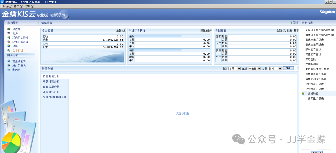 3. 经营分析:包含毛利分析、收付款分析、库存分析、订单执行分析、物料分析。