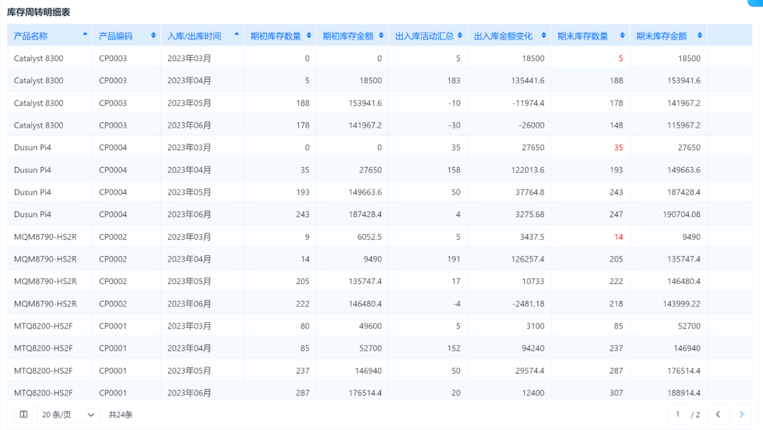 ![]() 举个例子,怎么计算? 假设你是经营服装店的,销售成本(也就是你卖出去的衣服的成本)是10万元,期初库存是5000件衣服,期末库存是3000件。 那么,先算出平均库存: 平均库存 = (5000件 + 3000件) / 2 = 4000件 接下来,用公式算库存周转率: 库存周转率 = 10万元 / 4000件 = 25次 这意味着,你每年大约能把库存“转”25遍,也就是说,你的库存卖得比较快,效率不错,资金也能迅速回笼。 ![]() 四、具体计算步骤 听起来库存周转率计算起来还是很简单的,但在实际情况中,库存的种类数量一多起来,库存周转率就没那么好算清了! 当然,我们也可以直接借助一些系统工具,自动计算库存周转率。 接下来给大家演示一下,库存周转率具体应该如何分析: ![]() 计算库存周转率需要使用 5 张表单,分别是: