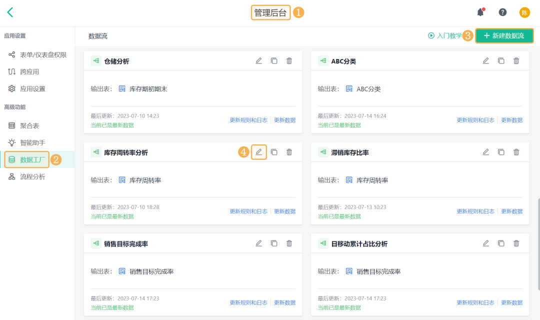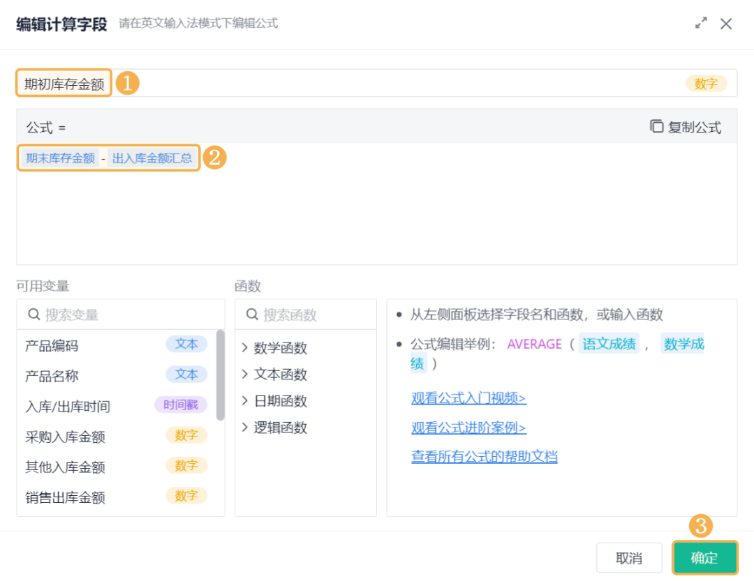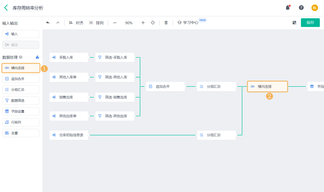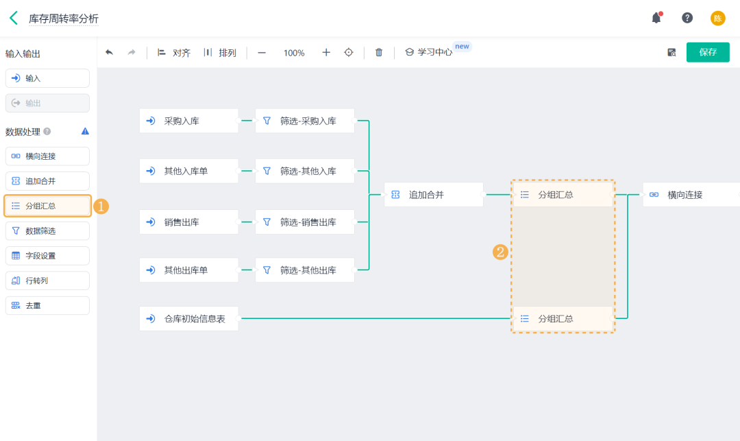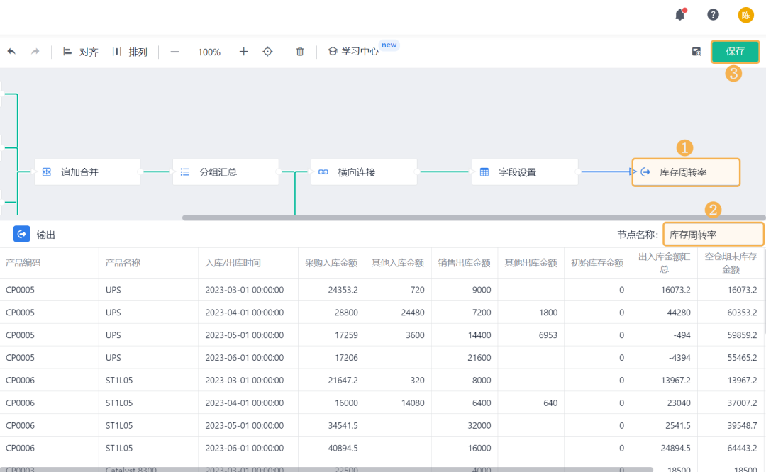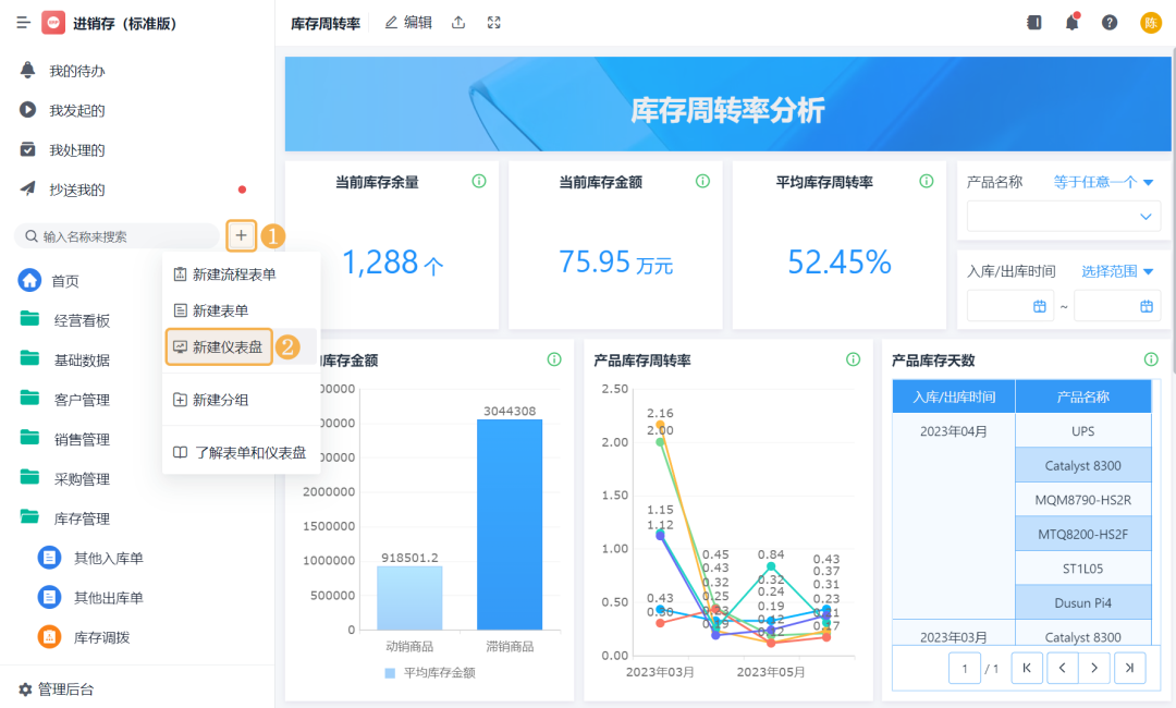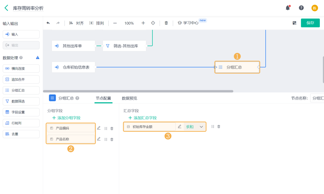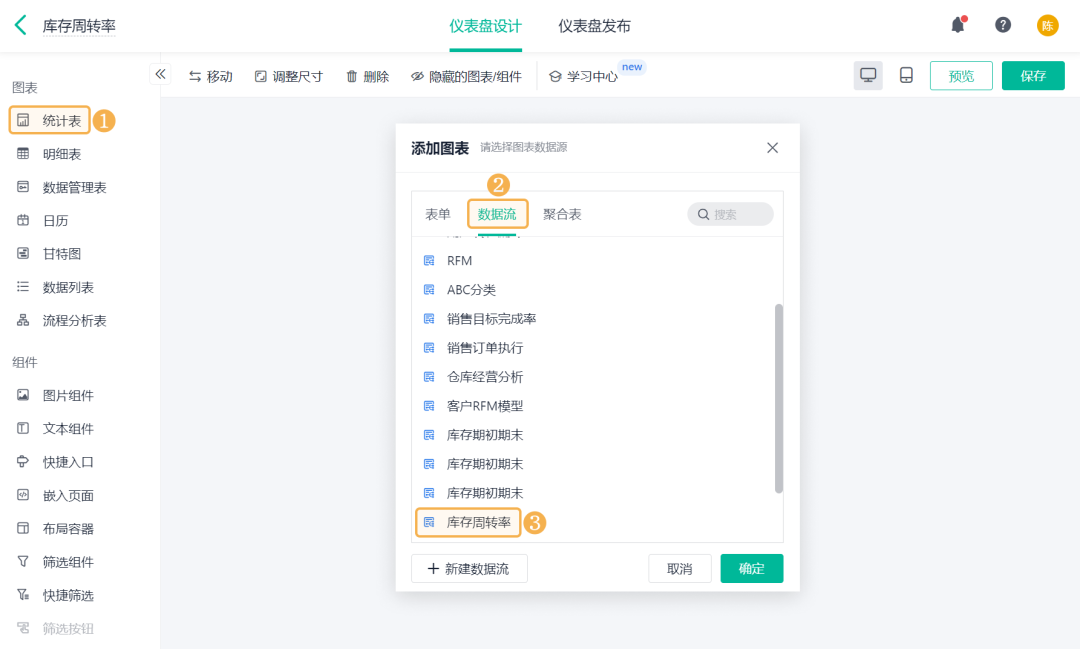 ![]() 3)期末库存金额 期末库存金额是指:一个库存会计时期结束时,可供使用或出售的存货库存余额。 添加「公式计算」,设置字段名称为「期末库存金额」,设置公式为空仓期末库存金额+初始库存金额。 ![]() 4)期初库存金额 期初库存金额是指:一个库存会计时期开始时,可供使用或出售的存货库存余额。 添加「公式计算」,设置字段名称为「期初库存金额」,设置公式为期末库存金额-出入库金额汇总。 ![]() (8)保存数据流 全部设置好以后,将输出节点重命名为「库存周转率」,点击右上角的「保存」,即完成了数据工厂的全部设置。 ![]() 2、仪表盘展示 (1) 新建仪表盘 数据工厂设置好后,可将数据流放在仪表盘中进行展示。回到应用访问界面新建一张仪表盘: ![]() (2) 产品库存周转率 产品库存周转率是企业在一段时间内销货成本与平均存货余额的比率,可用于反映存货的周转速度,判定存货的流动性及存货资金占用量的合理性等。 1)添加一个统计表,数据源为刚刚新建的数据流。点击「统计表 >> 数据流」,选择「库存周转率」数据流: ![]() 2)添加计算字段,字段命名为「库存周转率」,设置公式为销售出库金额/((期初库存金额+期末库存金额)/2): ![]() 3)图表类型选择「折线图」,添加维度和指标如下: