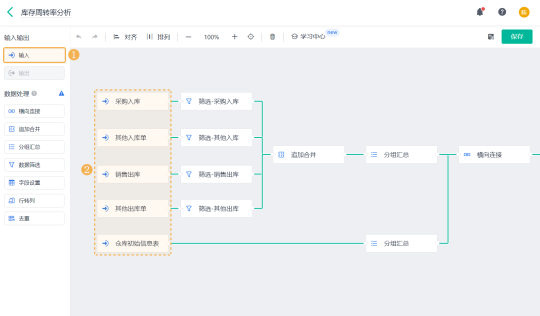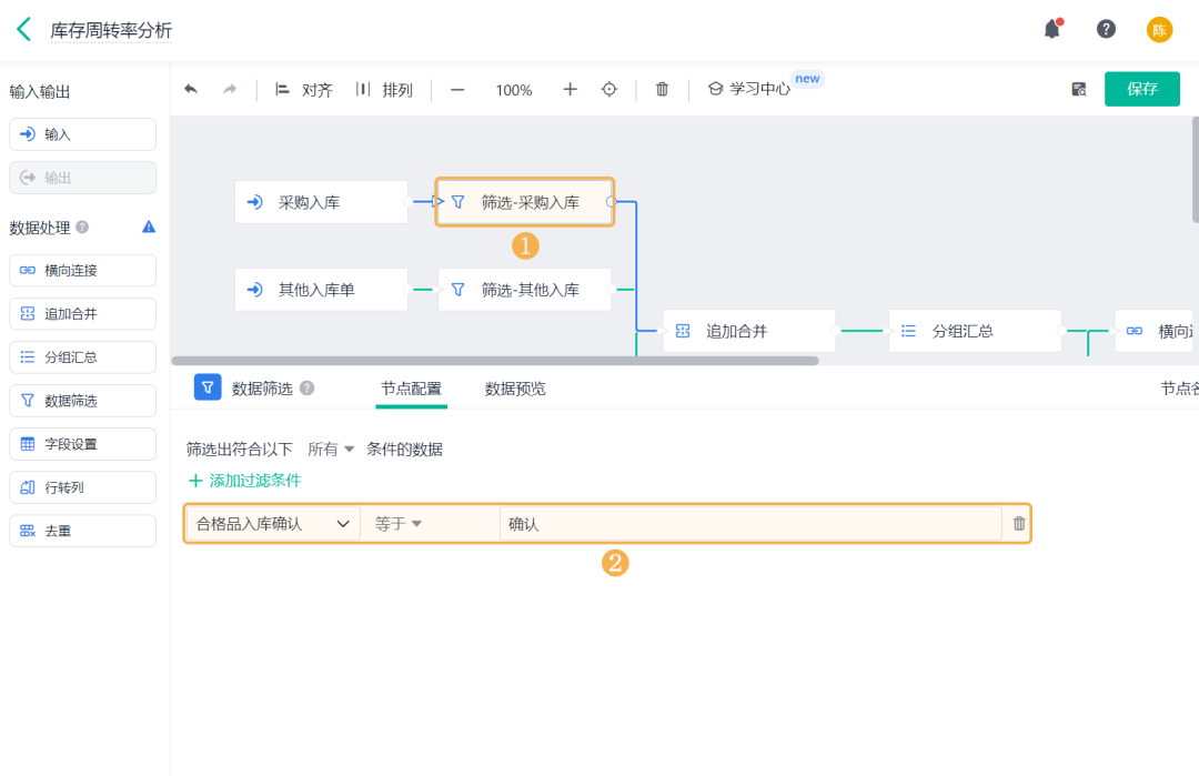 ![]() 1、数据工厂设置 (1) 新建数据流 进入「管理后台 >> 数据工厂」,可在右上角「新建数据流」,或直接点击「库存周转率分析」数据流查看示例内容: ![]() (2)设置输入数据源 添加库存相关表单作为输入节点的数据源,各表单选择字段 ![]() (3) 筛选合格数据 1)在「采购入库」、「其他入库单」、「销售出库」、「其他出库单」四个数据源后添加 数据筛选 节点: ![]() 2)通过入库/出库确认字段,筛选出字段值为「确认」的入库单/出库单。 以采购入库的数据筛选设置为例,添加筛选条件为:「合格品入库确认」等于「确认」;同理,设置其他数据源的数据筛选过滤条件如下: