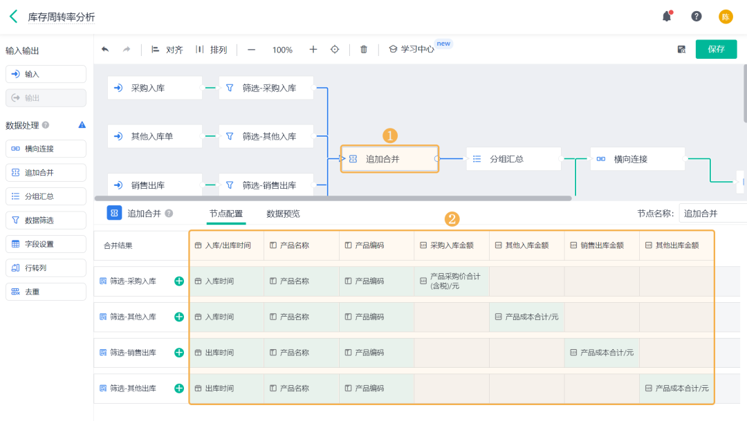 ![]() (4) 合并出入库数据 1)对数据筛选后的 4 张表单数据进行 追加合并,合并为一张表数据: ![]() 2)将不同表单中的出库/入库时间、产品名称、产品编码字段合并,并对各字段进行重命名,具体配置内容如下: ![]() (5) 分组汇总出入库总金额 1)在「追加合并」节点和「仓库初始信息表」后分别添加 分组汇总 节点: ![]() 2)其中,「追加合并」节点后的分组汇总用于计算各产品在不同月份出库/入库总金额: 分组字段:产品名称、产品编码、入库/出库时间(分组方式:「年-月」); 汇总字段:采购入库金额、其他入库金额、销售出库金额、其他出库金额,汇总方式:「求和」。 ![]() 3)「仓库初始信息表」后的分组汇总用于计算仓库中的初始库存金额。 添加「产品编码」、「产品名称」作为分组字段; 添加「产品成本合计」作为汇总字段,汇总方式设置为「求和」,重命名为「初始库存金额」。 ![]() (6) 横向连接 1)对分组汇总后的 2 张表单数据进行 横向连接,连接为一张表数据: ![]() 2)通过「产品编码」字段将两张表单的数据「全连接」为一张表,展示全部库存产品数据: ![]() (7)添加计算字段 在「横向连接」节点后添加 字段设置 节点,添加计算字段,用于计算出入库金额汇总、空仓期末库存金额、期末库存金额、期初库存金额: ![]() 1) 出入库金额汇总 出入库金额汇总是指:全部入库金额相加再去掉全部出库金额。 添加「公式计算」,设置字段名称为「出入库金额汇总」,设置公式为采购入库金额+其他入库金额-销售出库金额-其他出库金额。 ![]() 2) 空仓期末库存金额 空仓期末库存金额是指:对出入库总金额按照出/入库时间进行累加计算。 添加「累加汇总」,设置内容如下: