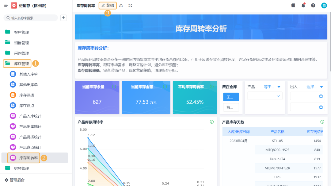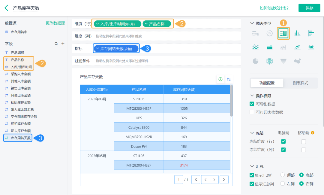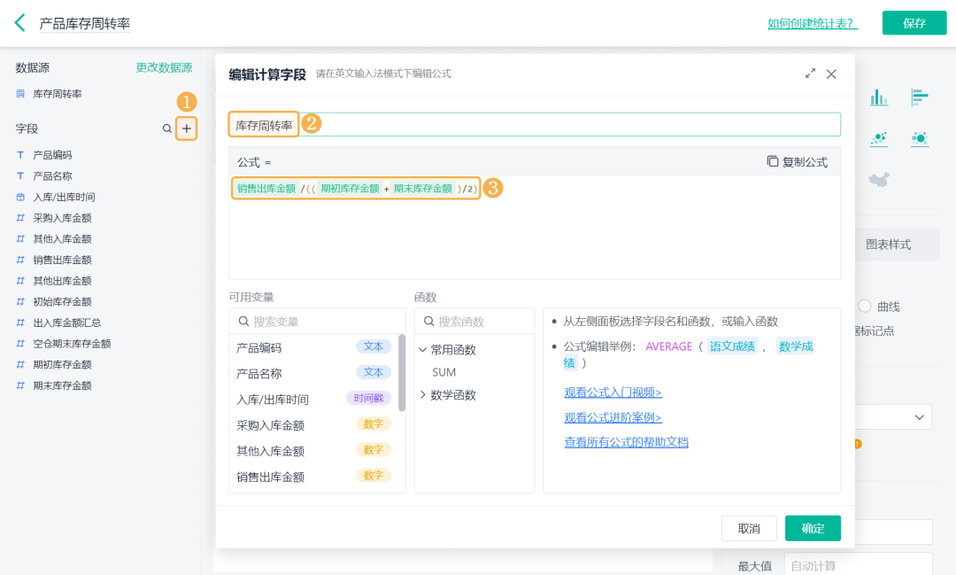 ![]() 4)设置「库存周转率 >> 数据格式」的小数位数为 2: ![]() (3) 产品库存天数 产品库存天数是指将库存周转率换算成具体的天数。 1)添加一个统计表,数据源为刚刚新建的数据流。点击「统计表 >> 数据流」,选择「库存周转率」数据流: ![]() 2)添加计算字段,字段命名为「库存周转天数」,设置公式为365/(销售出库金额/((期初库存金额+期末库存金额)/2)): ![]() 3)图表类型选择「透视表」,添加维度和指标如下: 维度:入库/出库时间、产品名称 指标:库存周转天数(求和) ![]() (4) 其他图表 1)还可以根据业务需求制作其他图表,如当前库存余量,当前库存金额、平均库存周转率等: ![]() 2)详细设置内容和界面配置可在「进销存(标准版)>> 库存管理 >> 库存周转率」处点击「编辑」查看: 库存周转率其实是一个反映你存货管理效率的重要指标。