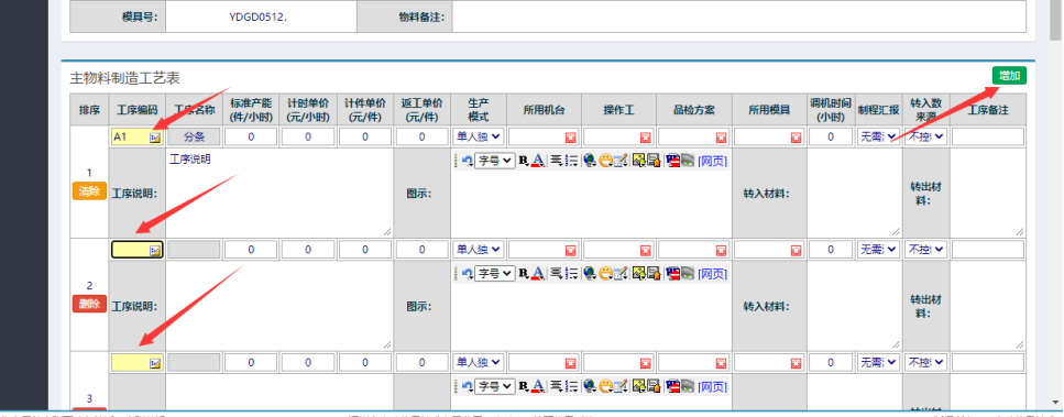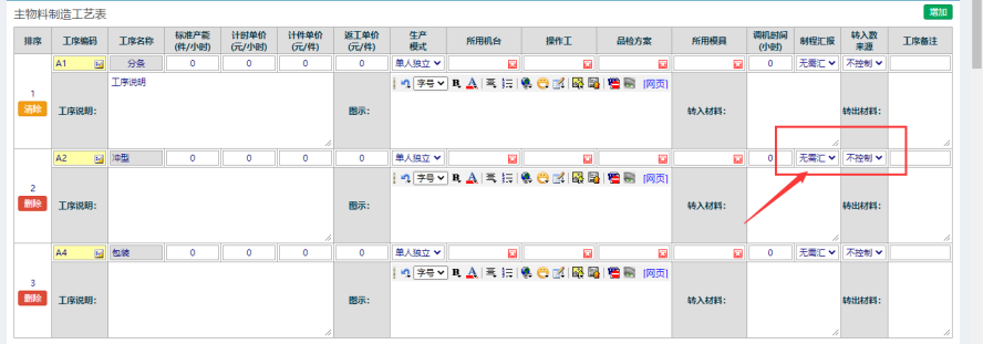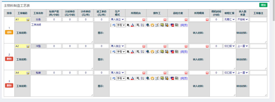 :点晴ERP-物料工艺资料维护![]() 操作步骤:工程管理-工艺资料管理 进入界面后,对应录入工艺路线信息,如下图: 关键信息录入说明,制程汇报设置与转入数来源设置