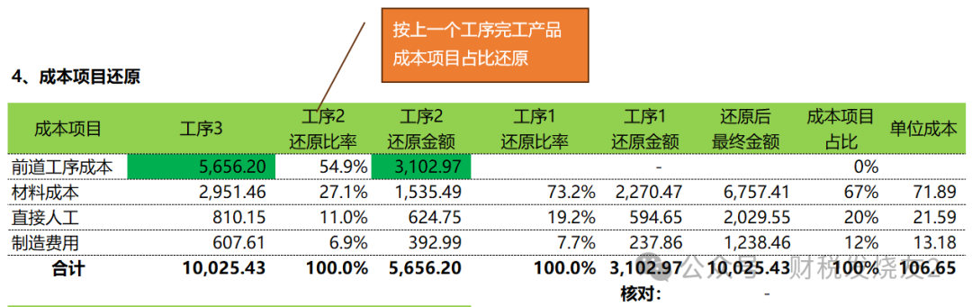 这个产品成本占比最大的是前道工序成本,占比56%,这个结构对于管控工序3是有意义的,但是对于公司更想知道这个完工产品中真正的料工费各占比多少于是我们需要进行成本还原动作-就是把最后1道工序中的前道工序成本进行还原为真正的料工费我们从工序3开始,因为完工成品中有前道工序的成本5656.2就是依据什么将这5656.2分摊到工序2中的成本项目结构呢?我们依据上一个工序完工产品的各成本项目占比进行还原比如工序2中的完工产品中的前道工序成本占比=2,925.40/5,332.52=54.9%;同样的方法可以计算出材料成本占比=27.1%;直接人工占比=11%;制造费用占比=6.9%;所以工序3中的前道工序的成本5656.2还原到工序的过程:前道工序成本=5656.2×54.9%=3102.97材料成本=5656.2×27.1%=1535.49然后继续将工序2中的前道工序成本3102.97继续还原到工序1的成本项目构成还原成功后就将工序3、工序2和工序2的料工费加起来就有了最终完工产品的料工费金额:当然我们也可以计算出完工产品成本中每个工序的成本占比: