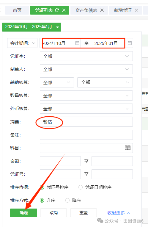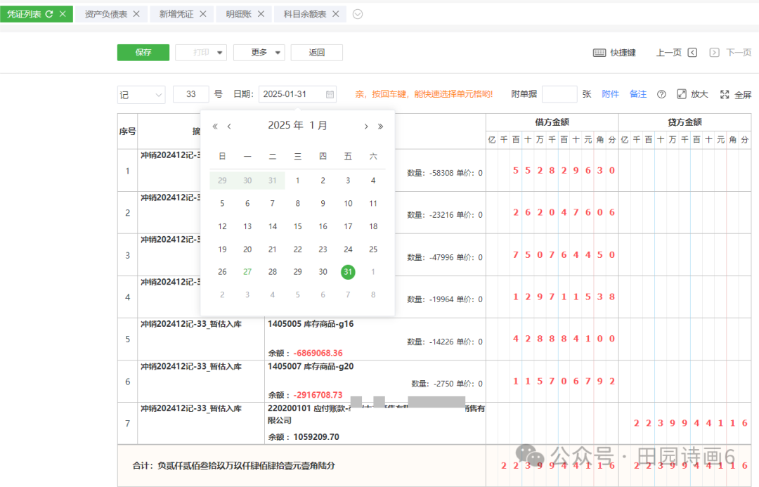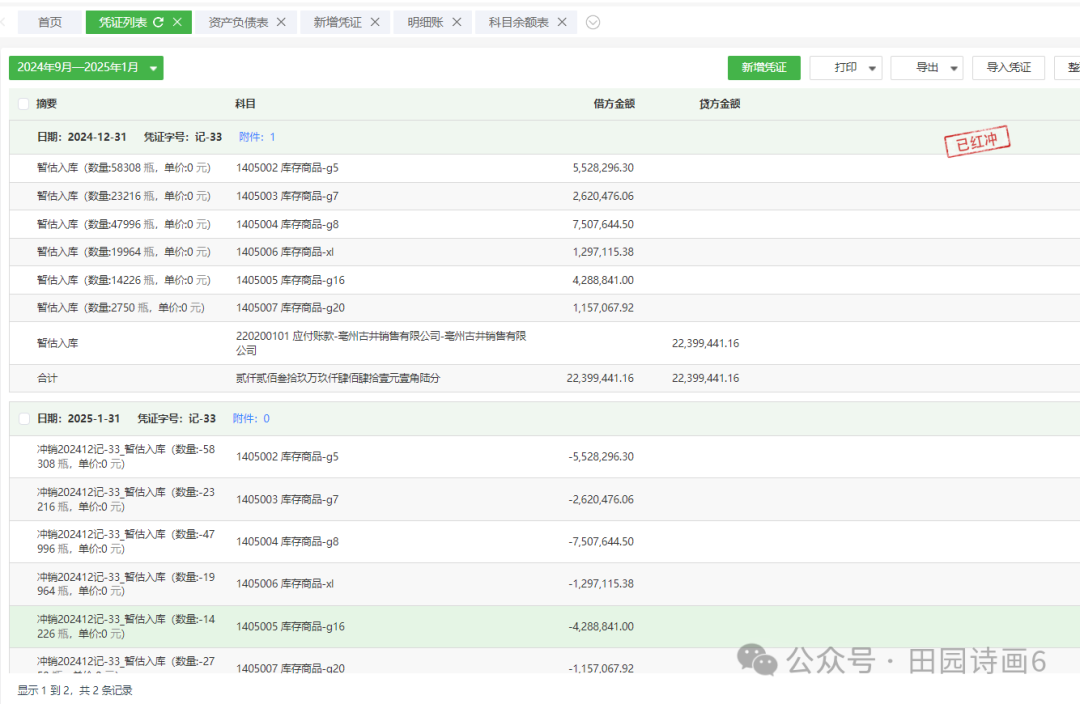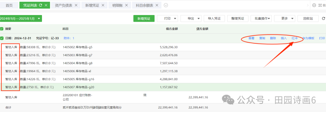 红冲情况。选择入帐的月分、日期,保存。摘要清晰显示红冲对应的月分、凭证号