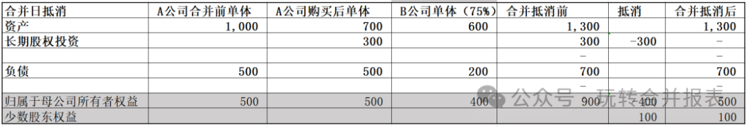 合并日: (1)A公司支付300万购买B公司75%的股权; (2)购买前A公司单体银行存款1000万,负债500万,所有者权益500万 (3)B公司资产600万,负债200万,所有者权益400万。 (4)购买后合并为资产1300万,长期股权投资300万,负债700万,所有者权益900万。 (5)合并日需要抵消母公司长期股权投资与子公司所有者权益。 (6)值得关注的是少数股东权益在合并日也需要体现,该部分属于少数股东。 合并日后如下: