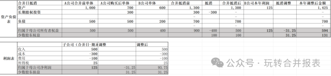 以上表格揭露了合并日及以后年度,合并抵消分录的原理。 合并日案例如下:(考虑少数股东的影响)