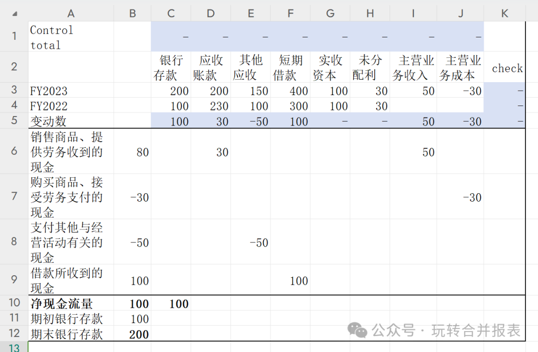 为了方便理解,现金流量表的”列“项与财报中现金流量表的披露展示方式一致。当把两期资产负债表、利润表,在第三、四行中填完后,我们需要将每个科目的变动数填至相应的现金流栏目下。第一行是用来核验的,变动数填写完毕后,现金流量表主表便可完成,附表则根据主表自动生成。