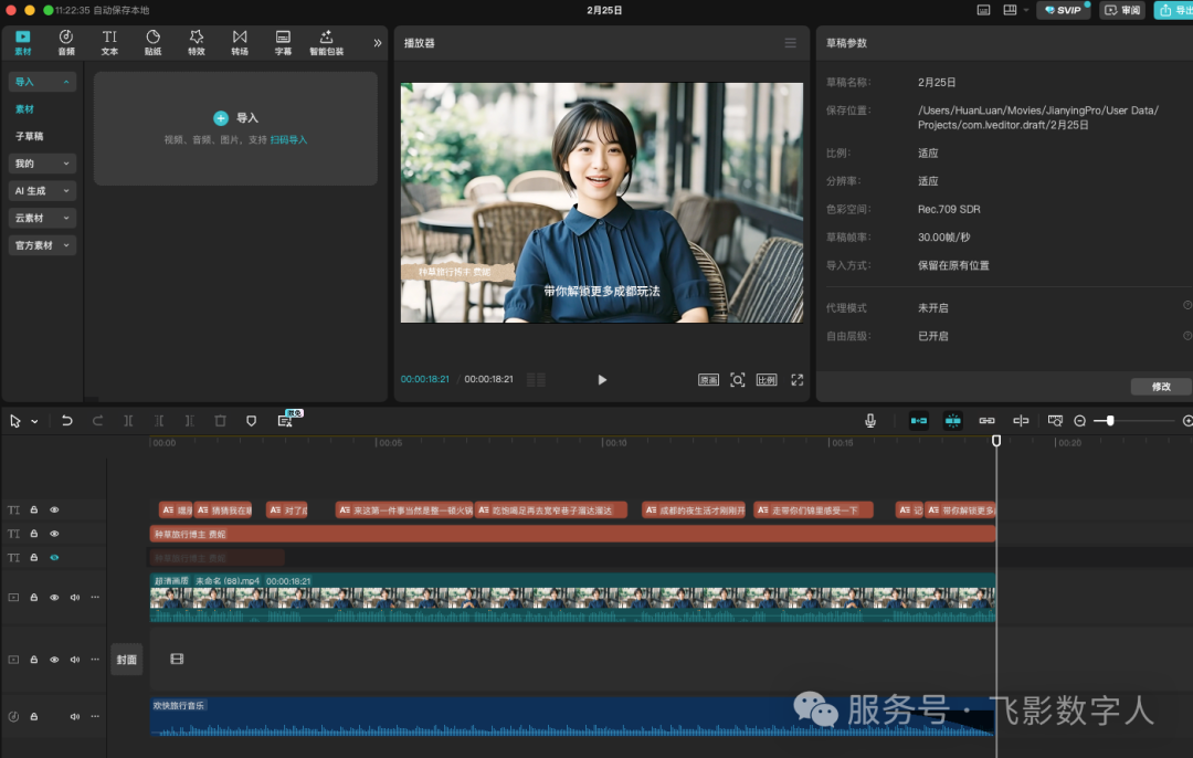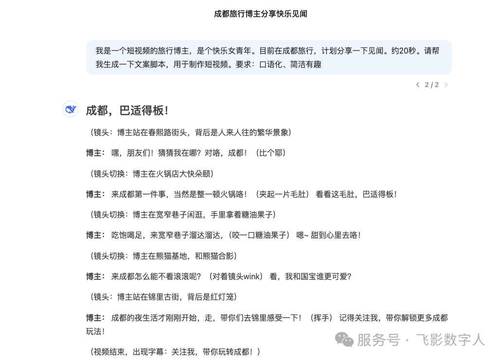 下面这个视频没有花一分钱,没有请模特、没有专业相机拍摄、没有配音演员、没有后期剪辑制作,不到10分钟就制作完成了。你敢信? (本视频由 AI 生成) 不需要复杂的技术,只需一台手机或电脑,DeepSeek + 飞影数字人这2个强大的 AI 工具,没有花一分钱,0成本就制作完成了,真正体验了“一键生成视频”。 下面附上详细教程,跟着来操作。(文末有福利) Step 1 让 DeepSeek 来自动生成视频文案(免费) 首先,打开 DeepSeek 官网:https://chat.deepseek.com/ 然后,输入提示词。要点:1)给人设 2)文案的主题和应用场景 3)文案风格 4)文案内容的长度、格式等其他要求 再继续,可以根据输出的结果进行多次调试,直至可以复制可用或者在此基础上,手动做微调即可。 以文章开头视频的内容生成为例子,只做了1次调整就基本可用。 - 提示词1:我是一个短视频的旅行博主,是个快乐女青年。目前在成都旅行,计划分享一下见闻。请帮我生成一下文案脚本,用于制作短视频。要求:口语化、简洁有趣