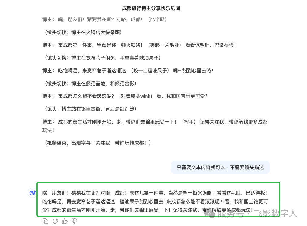 不过,我并不想真正的拿起镜头去拍摄,这里也只是需要文案内容即可,所以又进行了调试。 - 提示词2:只需要文本内容就可以,不需要镜头描述 DeepSeek 马上理解,秒输出了纯内容文案。