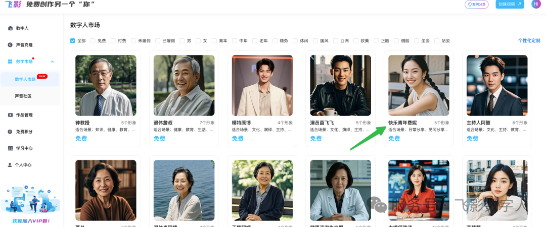 到此,文案部分搞定,直接拿来用,也就2-3分钟搞定了。(以上提示词和思路可以直接拿去用,加以变化和调整,基础文案都能搞定🤝) Step 2 让 飞影数字人 来一键生成视频(免费教程) 0成本体验教程: 选一个公共数字人(搞定形象)+ 选一个免费声音(搞定配音)+ 一键生成作品 首先,我们打开“飞影数字人”小程序或“飞影数字人” pc 网页版,以下使用“pc 网页版”为示例: 1.选一个公共数字人 a. 登录飞影数字人网页:https://hifly.cc
