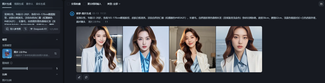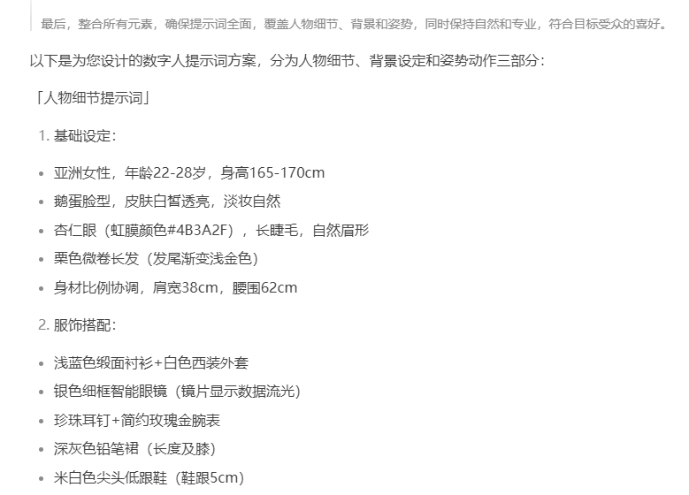 这其实,就是上个月,字节发布的一项研究成果:OmniHuman-1大模型。 不仅能够让照片张嘴说话,而且还能生成逼真的全身动态视频,从面部表情、身体动作、手势变化、物体交互等细节,都非常生动! 接下来,上操作步骤 我们可以借助DeepSeek,让他帮忙生成一个数字人形象。 提示词:我需要用AI做一个年轻女生知识讲解的数字人,请帮我生成人物细节的提示词以及背景的提示词。 DeepSeek不到30秒,就给我生成了,非常详细的数字人提示词: 亚洲女性,年龄22-28岁,身高165-170cm鹅蛋脸型,皮肤白皙透亮,淡妆自然杏仁眼,长睫毛,自然眉形栗色微卷长发(发尾渐变浅金色)身材比例协调,肩宽38cm,腰围62cm,浅蓝色缎面衬衫+白色西装外套,面对镜头