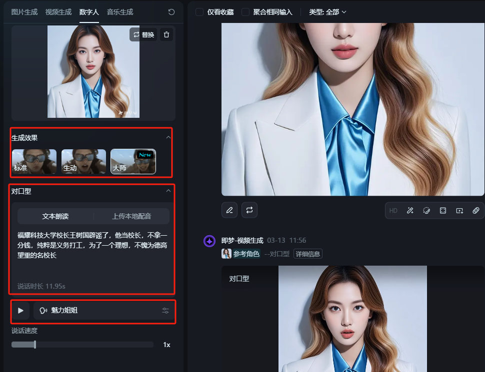 第三步,创作数字人视频 我们进去“数字人”的栏目,点击“对口型”,进入创作。 角色,我们直接用刚才的美女图片; 在生成效果上,我们就选择【大师】,能生成逼真的全身动态视频 然后选择文本朗读,或者上场本地配音。这里我们复制一段文案,也可以用DeepSeek写。朗读的音色,按照你的角色选择。
