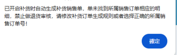 点晴模切ERP-弹出提示:已开启补货时自动生成补货销售单,单未找到所属销售订单相应的明细,禁止做退货审核,请修改补货订单生成规则或者选择正确的所属销售订单号