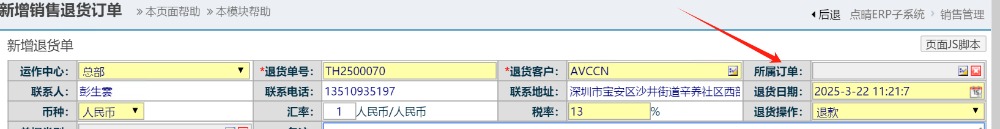 情况描述:审核销售退货单时弹出提示:已开启补货时自动生成补货销售单,单未找到所属销售订单相应的明细,禁止做退货审核,请修改补货订单生成规则或者选择正确的所属销售订单号 如下图: ![]() 原因:做销售退货单时未选择对应销售订单号