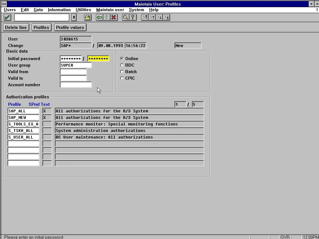 今天看到了一篇文章,上面有不少SAP 30多年前的系统界面,有点感触,所以写了这篇文章。 现在就让我们回到过去,时间点是1994年,可能有些读者还未出生了。 当时SAP的版本是:SAP R/3 2.1D,我们一起看看当时的系统界面,并从界面中看看当时的系统架构和功能。 从下图的登录界面,可以看到30多年前的SAP就支持了多语言,支持了非常经典的多Client的架构。其中多Client的架构,今天的国产软件很少具备这种类似的架构。 下图是今天的登录界面,没什么变化 ![]() 从下图的系统菜单,可以看到当时的SAP已经是一个非常完整的ERP,人财物都包含在内,也就是后勤(SD、MM、PP)、财务、HR,这三大领域都已经有了,并且在财务领域,已经有了FI模块、CO模块(管理会计)、资金模块以及合并报表模块了,PS模块也有了。 ![]() 从下图创建用户和分配权限的界面,可以看出来,