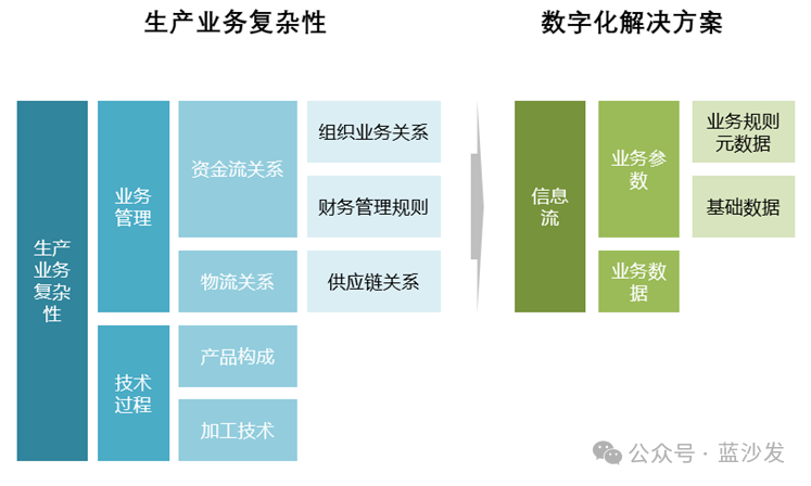 总结 生产业务的复杂性包括三个方面:产品技术决定的工艺过程复杂性,产品构成和供应链关系决定的物流关系复杂性,财务管理决定的物流资金流关系复杂性,前者表现在技术操作层,后两者体现在管理层。因此,生产管理复杂主要就是物流和资金关系的复杂性上,它们需要通过严格细致的参数驱动的信息流予以实现,因此,生产业务架构设计中的重难点在于数据,而数据的重难点在于基础数据,特别是业务规则数据。
