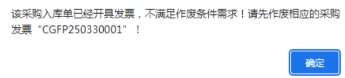 点晴模切ERP-弹出提示:该采购入库单已经开具发票,不满足作废条件需求!请先作废相应的采购发票
