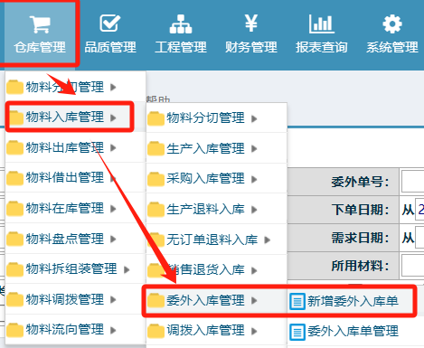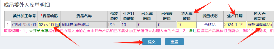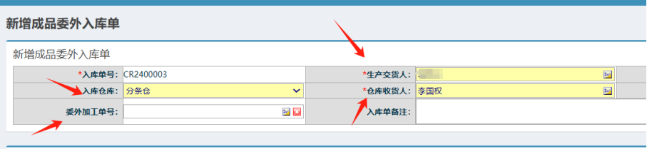 填选入库仓库,交货人,委外加工单等等 如下图: