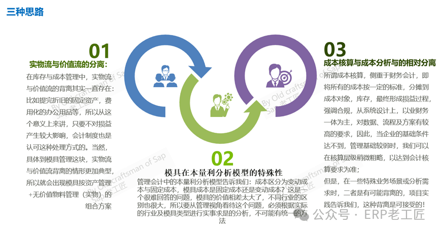 综上,由于模具不同于物料,也不同于资产,在不同的行业中,模具的成本占比大小不同,因此,模具管理是项目方案设计的难点之一,大概可以总结为以下几点:1.模具成本归集困难:自制模,外购模,客供模,修模费等各种成本,由于不是公司的主流生产,用哪种方式来归集成本是个难题,尤其是在多系统集成本数字化公司;2.模具成本摊销方法困难:模具是生产产品组件的成本组成,而一般的成本核算是以成品或半成品为成本对象,这就天然的造成了模具成本摊销的困难---无法将模具成本按传统的成本动因(Cost Driver)进行摊销;同时,模具的设计寿命与实际寿命的不同---这是模具的常态,也更加加剧了模具成本摊销的困难。3.模具的实物管理困难:模具的形态不同于常规产品,经常会是各种组合;另外,模具是否完好,是否需要大修等非专业人员无法识别;模具经常会存在供应商工厂等,盘点、实物管理等更难处理;从财务会计的核算角度,模具作为资产,低值易耗品,辅料或直接费用化;但从管理会计角度,模具需要按产品组(项目),跨周期进行全生命周期管理。口径与方法的不同,给模具管理带来新的挑战!复杂的场景,成本归集与摊销,实物管理的种种困惑,告诉我们设计流程与方案时必须面对的事实,事实上,我们没有办法设计统一的方案满足各种场景---无论技术多么先进完美,面对这类复杂的业务场景时,首先应该从管理入手,从管理视角,梳理一下管理的思路—特别是面对这种场景与需求时,必须改变的或提升的观念,然后再考虑技术实现手段。这是我解决这类复杂需求的常用方法。在库存与成本管理中,实物流与价值流的背离其实一直存在:比如提完折旧的固定资产,费用化的办公用品等,所以从这个意义上来讲,只要不对损益产生较大影响,会计制度也是认可这种处理方式的。当然,具体到模具管理这块,实物流与价值流背离的情形更加典型,所以就会出现模具按资产管理+无价值物料管理(实物)的组合方案。管理会计中的本量利分析模型告诉我们:成本区分为变动成本与固定成本,模具成本到底是属于固定成本还是变动成本?这是一个很难回答的问题,模具的价值相差太大了,不同行业的区别也很大,所以要从管理视角看待这个问题,必须根据实际的行业及模具类型进行实事求是的分析,不可能有统一的方法。成本核算(FI核算)与成本分析(CO管报)与的相对分离:所谓成本核算,侧重于财务会计,即将所有的成本按一定的标准,分摊到成本对象,库存,最终形成损益过程,强调合规,从系统设计上,以业财务一体为主,对数据、流程及方案有较高的要求,因此,当企业的基础条件达不到,管理基础较弱时,我们可以在核算层级稍微粗略,以达到会计核算要求为准。而成本分析以内部管理考核为准,按照“数据同源”的原则,数据来源应该与成本核算同维度,同口径。但是,在一些特殊业务场景或分析需求时,二者是有可能背离的,项目实践告诉我们,这种背离是可接受的! 成本分析需求在事后通过开发报表或其他技术工具方式实现。这样做,最大好处理对数据流程的依赖性有所降低,同时也基本满足了成本核算与成本分析的需求。这就是所谓的成本核算与成本分析的相对分离的概念。在考虑模具处理方案时,也有必要参考这种管理理念,问题就会变得好理解一些。甚于于以上痛点及解决思路,初步小结以下7种解决方案:方案1按固定资产管理:按套模具建立资产卡片,在资产使用期内,按月摊销折旧成本,这种情况下,折旧成本一般作为“公共”的费用,平均摊销给该产线的所有产品,一般是按机器工时分摊。这种方式,一般适用于金额较大的压铸模,注塑模等。从“成本分析”来看,这种方式,有明显的管理缺陷,模具的成本没有摊销到正确的成本对象上,摊销金额也经常背离模具的使用周期。方案2按库存物料管理+领用直接费用化:模具在入库时,作为库存物料,领用时,一次性作为费用消耗处理。这种方式仅适用于单价较小,数量众多的塑胶玻璃木质模具,这类模具大多类似于工装夹治具。事实上,为了准确分摊成本,在项目中,可能有各种变通的开发方案辅助方案3:以模具理论产出量作为库存数量,模具物料作为BOM组件,按实际的生产消耗量推算模具用量并减少库存量。优点:将模具成本摊销到对应的产品中,成本核算较准确缺点:这类物料的价值与实物料背离较大,账实不符成为常态化,适用于模具用量较大,或者模具可重复使用的情况。比如:某个模具设计理论寿命是10000次,生产产品A时,BOM抬头基本数量为1000,哪么BOM中的用量应该是0.1,按这个用量作为BOM组件,如果该模具的成本为5000元,哪么标准成本时,要分摊5000*0.1的成本,在生产订单入库时,如果该生产订单产量是3000PC,哪么要消耗的该模具数量=3000/1000*0.1=0.3,该生产订单消耗的模具成本=0.3*5000=1500.方案4 以模具理论可使用次数为(虚拟)库存数量,并作为BOM子组件搭入BOM,举例如下:某模具的理论设计使用寿命为10000次,如果采购成本为5000元,哪么在采购入库时,按数量10000入库,单价=5000/10000=0.5(元/模次)在搭建BOM时,如果BOM的抬头基本数量是1000,哪么就消耗模次数量1000,标准成本应该分摊的模具成本=1000*0.5=500。同样,在生产订单入库或发料时,计算用量,如果生产订单的产量为3000,哪么应该计入订单的模具成本为3000*0.5=1500。与上述样例计算结果相同。优缺点与上述方案3类似,只是思路