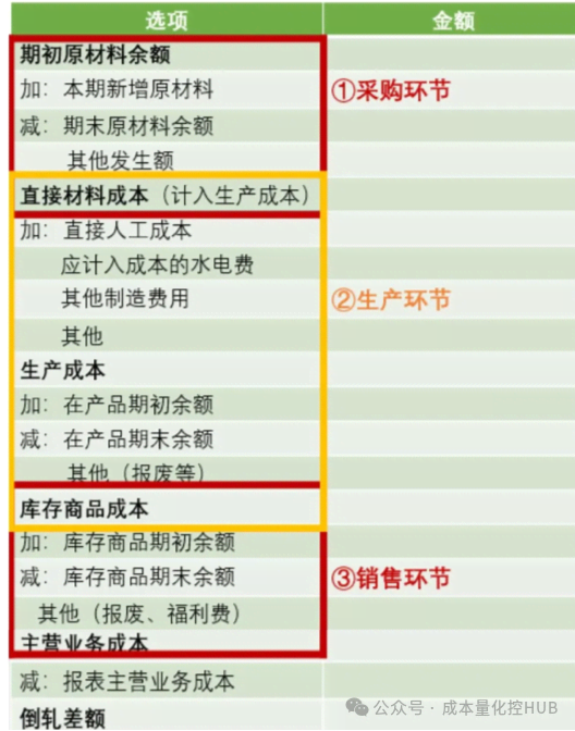 如何编制: 从原材料采购到主营业务成本的过程就是成本倒轧表的填列过程。 一个原则: 成本倒轧表的倒轧原则:“与实现本步骤目的无关的操作,就剔除。” 成本倒扎表剔除了生产成本中重复结转的金额,其目的是 吹糠见米。 六个步骤: 第一步:计算直接投入生产直接材料的原材料 直接投入生产直接材料的原材料=①原材料期初数+③本期原材料借方-②原材料期末数-④剔除项 这里说下很容易导致最终成本倒扎表扎不平的坑-----剔除项: 1.原材料盘亏:原材料盘亏成本硬生生少了,没有在本步骤投入生产,要剔除; 2.原材料被研发领用:研发领用当然没投入生产,要剔除; 3.原材料办公领用:没投入生产,要剔除; 4.原材料委外加工领用:委托加工物资在本步骤并没有直接投入生产,就要剔除。 原则“与实现本步骤目的无关的操作,就剔除”,虽然委外加工最终投入了生产,但是在这一步并没有,就要剔除。 5.原材料计入制造费用:有专门“直接人工”“制造费用”的项目来涵盖。 6.原材料直接销售:原材料直接销售了,无论是计入主营业务成本,还是计入其他业务成本,因为在这一步没有直接投入生产,那就要剔除。 7.其他非投入生产的剔除项:上面罗列了一般生产企业原材料贷方没有计入生产的主要剔除项。如果还有其他的也要剔除。 第二步:计算生产成本本期增加额 生产成本本期增加额=直接投入生产直接材料的原材料+直接人工成本+制造费用 原材料投入生产后,在工人操作下,再投入水电、设备、房租等制造费用,就是本期投入到生产的成本。 第三步:计算产成品生产入库成本 产成品生产入库成本=在产品期初金额-在产品期末金额+生产成本本期增加额-剔除项 第四步:计算产成品销售出库金额 产成品销售出库成本=产成品期初余额-产成品期末金额+产成品盘盈金额+退货收回产成品成本+外购的成品入库金额-自制自用产品成本-内部领用产品成本-产成品折价盘亏报损-委托加工物资领用库存商品-研发领用产成品-其他剔除项 第五步:计算产成品销售结转主营业务成本 如果存在发出商品的话,产成品的销售出库金额一部分结转了主营业务成本,一部分计入了发出商品,所以需要考虑期初发出商品和期末未结转成本的发出商品,才是产成品结转主营业务成本的金额。 如果企业将直接销售的原材料和半成品计入了主营业务成本,那么这里需要再加回来。 第六步:核对调整 在核对前,还要将非产成品、非原材料、非半成品销售计入主营业务成本的等项目挑选出来,比如销售物流费、仓储费等,然后将倒轧出来的销售成本与报表主营业务成本进行核对。如果还有差异就要再返回头看一下是哪一项漏了,或者数据统计不准确。 逻辑一致 — 剔除项: 上述描述的内容为从原材料到主营业务成本的倒轧过程,实际过程中可能会涉及到 各式各样的例外情况,这些需要在相应的项目下进行剔除或调整。 主要集中于原材料阶段和半成品的阶段,典型的有:
