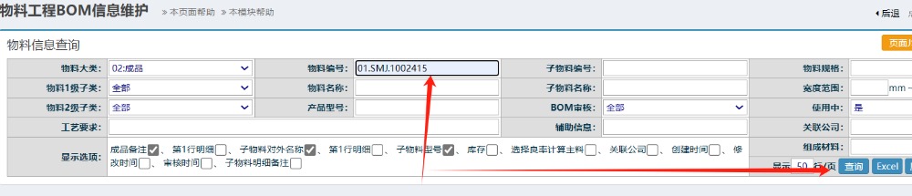 :点晴ERP-BOM导出excel-操作流程![]() 点击进入 如下图: ![]() 输入成品料号后查询出该料号的BOM明细 如下图: