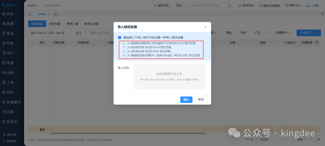 在发票管理中,目前支持销项发票、进项发票和费用小票的录入,录入的方式有【导入】和【新增】两种,导入又分为发票识别导入和税控平台文件导入; 发票识别即将发票图片上传识别相关数据,而税控平台文件导入顾名思义是将数控平台里的发票数据文件导出后上传导入(建议使用) 新增的话就简单了,就是将发票数据手工填写进去。