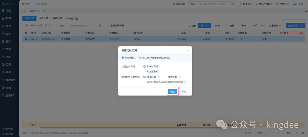 导入或新增好发票数据后,勾选需要生成凭证的发票,点击右上角的【生成凭证】按钮,就可以生成凭证啦