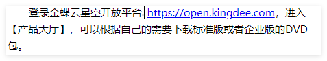 本文以安装金蝶云星空V9企业版,并升级9.0.0.20241121版本为例,描述整个金蝶云星空测试环境的搭建过程,方便客户更加快速准确的搭建测试环境。 主要应用场景为: 1、 金蝶云星空公有云环境搭建线下测试环境; 2、 补丁升级前,先搭建金蝶云星空测试环境测试升级; 3、 开发、对接等测试需求下的金蝶云星空测试环境搭建。 2.金蝶云星空测试环境搭建过程2.1 下载金蝶云星空V9安装包1、 DVD包下载路径 点击产品介绍说明,进入产品详细介绍页面,点击【下载安装包】进行安装包下载。