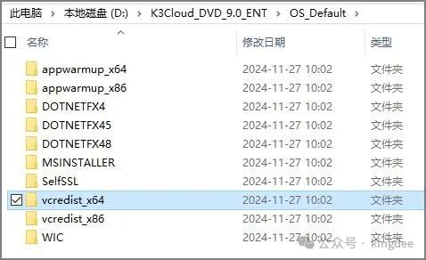 4. 在安装包中找到安装包K3Cloud_DVD_9.0_ENT\OS_Default\vcredist_x64安装vc_redist.x64.exe(如果操作系统自身不带.net4.8,还需要在安装包K3Cloud_DVD_9.0_ENT\OS_Default\DOTNETFX48中找到ndp48-x86-x64-allos-enu.exe进行安装)。