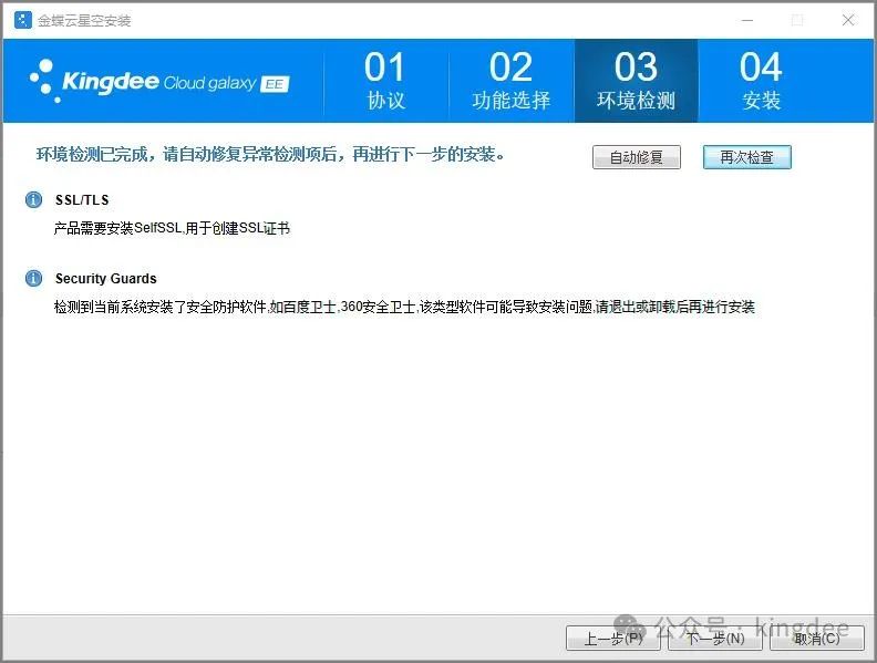 3、下一步之后,会进行环境检测,因为在之前已经安装好必要的环境依赖,所以检测基本可以通过,下图中的2个可以忽略(安全软件最好在安装过程中退出,可能出现误拦截的情况)。